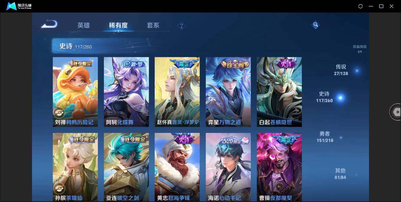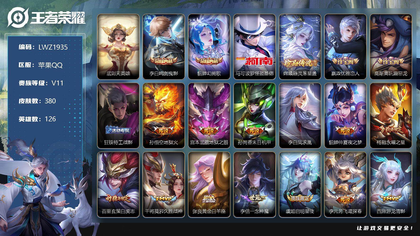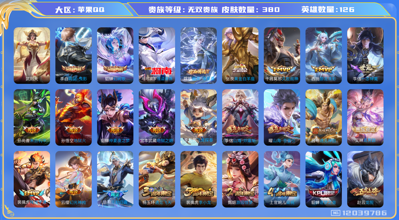 [12039786]【暑期末清货/特价急出/永久包赔】:苹果Q-V11-至尊星耀II段位-126英雄-380皮肤-2典藏-2珍品传说-27传说-117史诗