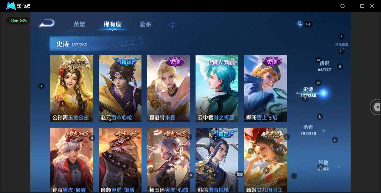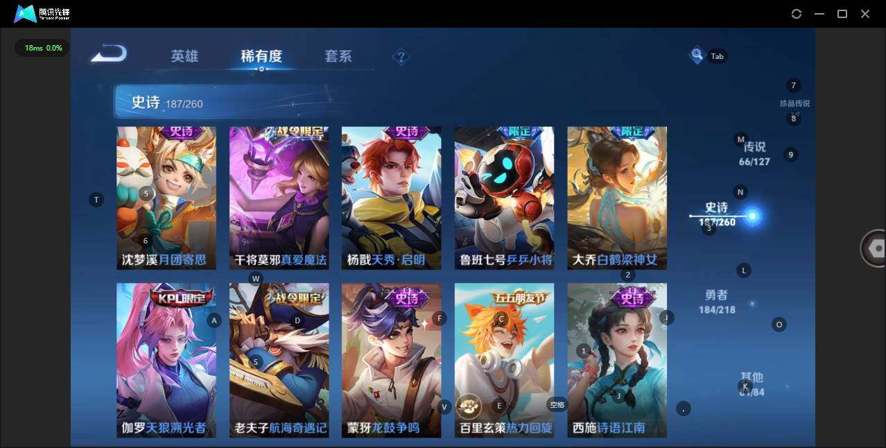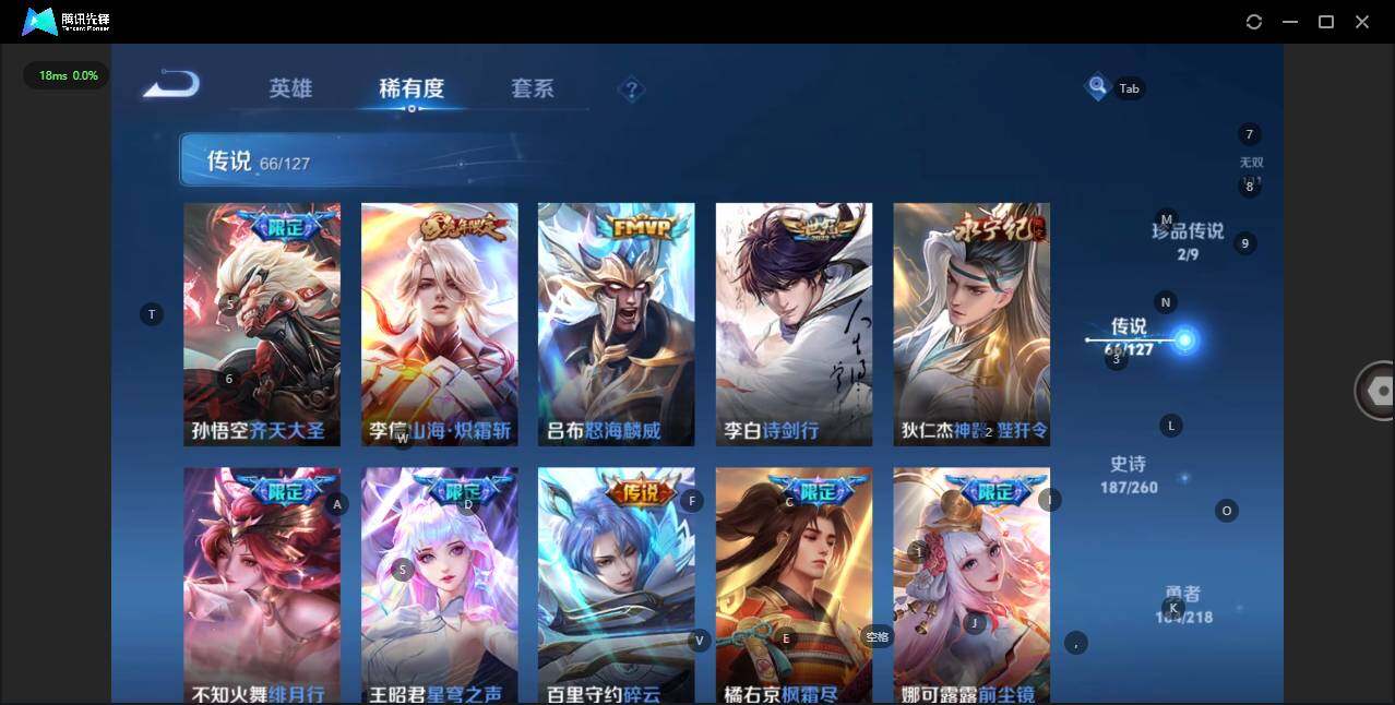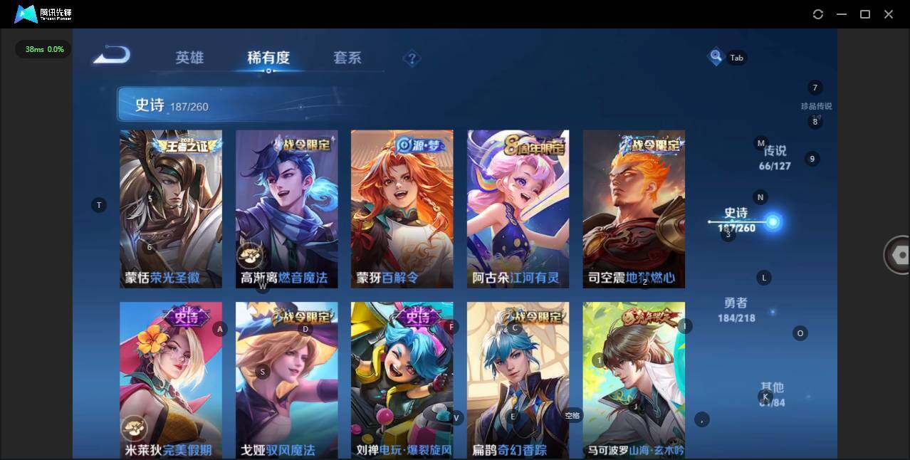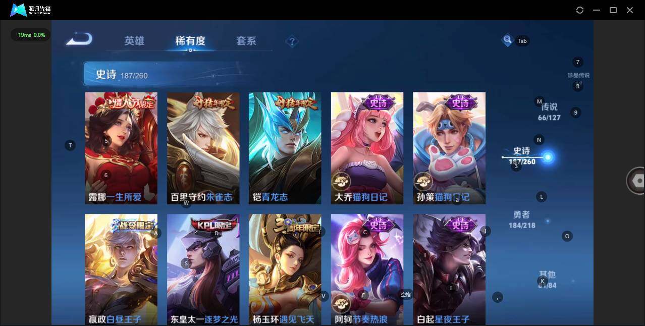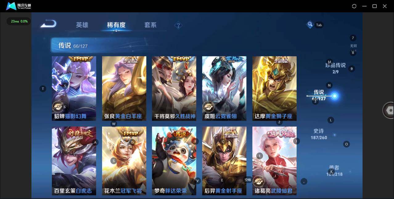 - [12116553]V7 1珍品传说 5传说 123英雄 188皮肤 可修改实名 优质装备:怪盗基德,超时空战士-狄仁杰,涂山容容 传说皮:幻光神枪 珍宝阁皮:万物之道,蔷薇恋人 限定皮:愿照·岁时盈(虞姬年限),鸣野蒿,瑞麟志(木兰年限),五谷丰年,游园惊梦,李小龙,大圣娶亲,深海之息(深海大菠萝) 史诗皮:器灵·浮梦炉,龙之律动,琥珀纪元伽罗,百相守梦-黄忠,蒙犽顽岩魄,怒海争锋,织梦人,紫霞仙子,电玩小子(小书包),白龙吟,黄金分割率,特工魅影,千年之狐,江河有灵,雪夜绮愿(周瑜),百解令(蒙犽),高渐离燃音魔法,蒙恬荣光圣徽,电玩·爆裂旋风,末日机甲-吕布,猫狗日记-大乔,乱世虎臣,节奏热浪,修罗,摇滚巨星,水果甜心,星夜王子,德古拉伯爵,暗隐猎兽者,幽灵船长,鬼剑武藏,心灵战警,纤云弄巧,缤纷独角兽,乘风破浪,逐浪之夏,水晶猎龙者,曙光守护者,箭羽风息,金属风暴,圣诞恋歌,鹰眼统帅,魅力维加斯,未来纪元-赵云