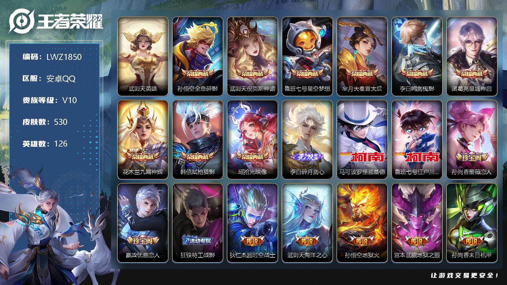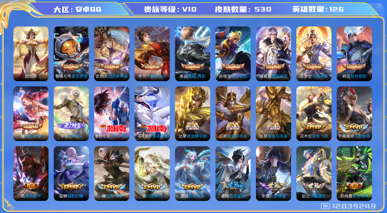 [12039249]打野34段【暑期末清货/特价急出/永久包赔】:安卓Q-V10-最强王者段位-126英雄-530皮肤-9典藏-1无双-2珍品传说-66传说-186史诗 【荣耀典藏】:武则天英雄,孙悟空全息碎影,武则天倪克斯神谕,鲁班七号星空梦想,芈月大秦宣太后,李白鸣剑曳影,诸葛亮星域神启,花木兰九霄神辉,韩信弑枪猎影,瑶拾光映像 【无双皮肤】:李白碎月剑心 【珍品传说】:马可波罗怪盗基德,鲁班七号江户川柯南 【内测皮肤】:孙尚香蔷薇恋人,嬴政优雅恋人,狂铁特工战影 【传说皮肤】:狄仁杰超时空战士,武则天海洋之心,孙悟空地狱火,宫本武藏地狱之眼,孙尚香末日机甲,貂蝉仲夏夜之梦,诸葛亮武陵仙君,后羿黄金射手座,梦奇胖达荣荣,花木兰冠军飞将,百里玄策白虎志,达摩黄金狮子座,虞姬云霓雀翎,干将莫邪久胜战神,张良黄金白羊座,貂蝉猫影幻舞,伽罗太华,刘备时之恋人,李信一念神魔,曜云鹰飞将,关羽武圣,孙悟空零号赤焰,虞姬启明星使,镜炽阳神光,铠绛天战甲,诸葛亮时雨天司,兰陵王默契交锋,李元芳飞鸢探春,小乔音你心动,周瑜音你心动,曜李逍遥 ,西施游龙清影,王昭君乞巧织情,赵云淬星耀世,貂蝉遇见胡旋,孙尚香异界灵契,鲁班七号寅虎瑞焰,裴擒虎寅虎赤拳,瑶时之祈愿,孙策末日机甲,女娲补天,蔡文姬花朝如约,露娜启示之音,孙策挚爱之约,马超无双飞将,后羿无尽星芒,娜可露露前尘镜,橘右京枫霜尽,百里守约碎云,王昭君星穹之声,不知火舞绯月行,狄仁杰神器狴犴令,李白诗剑行,吕布怒海麟威,李信山海炽霜斩,孙悟空齐天大圣,虞姬无限倾心,干将莫邪画中仙,张飞百相守梦,艾琳觅芳踪,澜逐花归海,铠琥珀纪元,马超琥珀纪元,桑启鸣野蒿,司马懿九山相柳,大司命死亡执政官 【限定皮肤】:暃埋骨钱,蒙犽顽岩魄,蔡文姬夏日便利店,大乔绒语心约,虞姬夏日便利店,姜子牙天穹之誓,杨戬破阵退雄兵,狄仁杰阴阳师,小乔纯白花嫁,廉颇寅虎御盾,赵云皇家上将,赵云引擎之心,赵云龙胆,赵云百木心枪,墨子神迹守卫,墨子降魔,妲己热情桑巴,妲己时之奇旅,嬴政优雅恋人,嬴政白昼王子,孙尚香蔷薇恋人,孙尚香异界灵契,鲁班七号狮舞东方,鲁班七号乒乒小将,鲁班七号寅虎瑞焰,庄周云端筑梦师,庄周高山流水,阿轲迷踪丽影,钟无艳超时空战士,孙膑天狼运算者,孙膑寅虎展翼,扁鹊奇幻香踪,白起夜都怪侠,芈月重明,芈月幻夜卜梦,吕布猎兽之王,吕布御风骁将,周瑜真爱至上,周瑜
