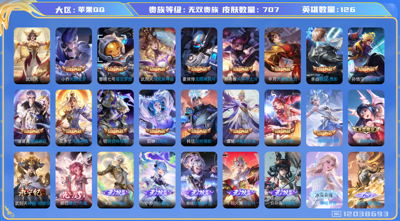 [12038693]【商品标题】:苹果Q-V11-最强王者段位-126英雄-703皮肤-17典藏--10无双-7珍品传说-124传说-251史诗