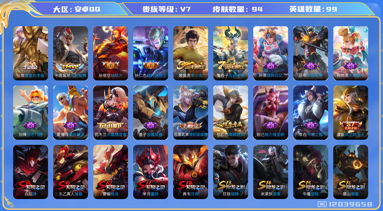 - [12291716]V7 1典藏 12传说 124英雄 221皮肤 可修改实名 优质装备:九霄神辉(木兰典藏),黄金狮子座,云鹰飞将(小将军),一念神魔,胖达荣荣,李逍遥,超时空战士-狄仁杰,山海·炽霜斩(李信年限),山海·苍雷引(电光曜子),涂山容容 传说皮:幻光神枪 珍宝阁皮:万物之道,蔷薇恋人,玩趣恶龙 限定皮:愿照·九州拓(澜年限),逐霄战戟,鸣野蒿,至尊宝,白虎志(电光耗子),白晶晶,神威(电光马子),高山流水,五谷丰年,冰锋战神,梁祝,御风骁将(吕布年限),天狼绘梦者,李小龙,孙行者,大圣娶亲,冰霜恋舞曲,美猴王,神器·万象笔 史诗皮:化蝶舞,星界战将,琥珀纪元伽罗,上官婉儿群星魔术团,百相守梦-黄忠,特工魅影,百解令(蒙犽),高渐离燃音魔法,蒙恬荣光圣徽,时之恋人-孙尚香,修罗,水果甜心,星夜王子,德古拉伯爵,暗隐猎兽者,幽灵船长,鬼剑武藏,心灵战警,天秀·启明,舞动绿茵,地狱岩魂,繁星吟游(呼啦呼啦),乘风破浪,逐浪之夏,水晶猎龙者,曙光守护者,金属风暴,原初追逐者,圣诞狂欢,鹰眼统帅,魅力维加斯,黎明之约,赏金猎手,无心