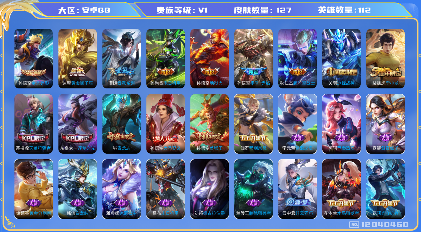 [12040460]【特价急出/详情看图】:安卓Q-V0-尊贵铂金II段位-112英雄-127皮肤-1典藏-7传说-31史诗