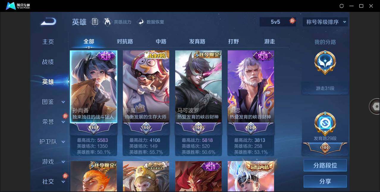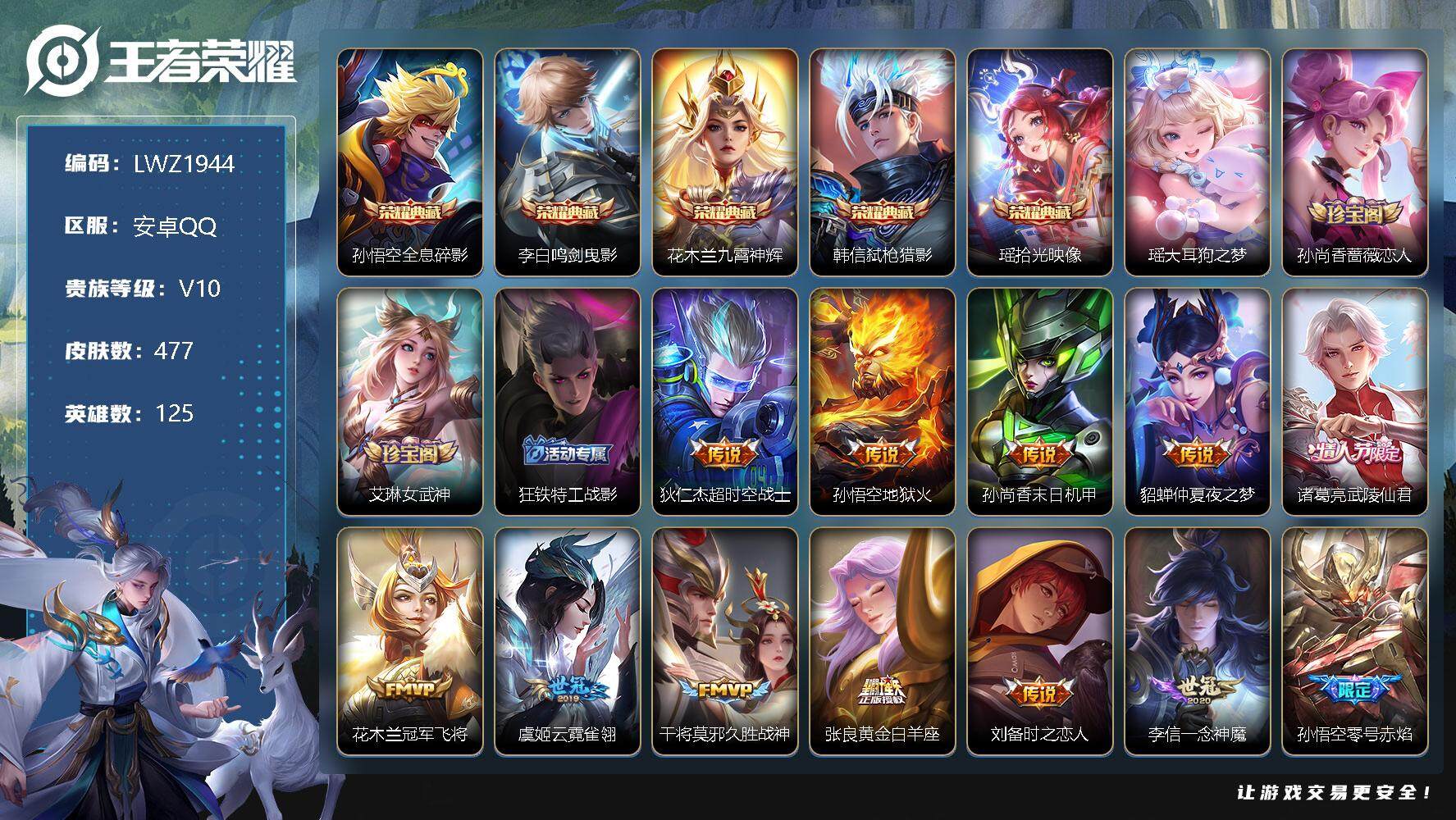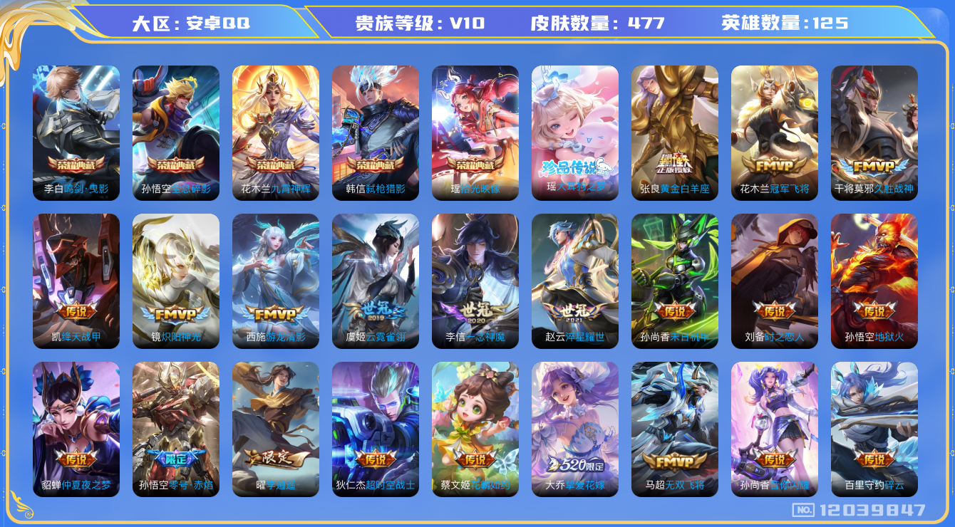 [12039847]游走31段【暑期末清货/特价急出/永久包赔】:安卓Q-V10-最强王者段位-125英雄-477皮肤-5典藏-1珍品传说-50传说-150史诗