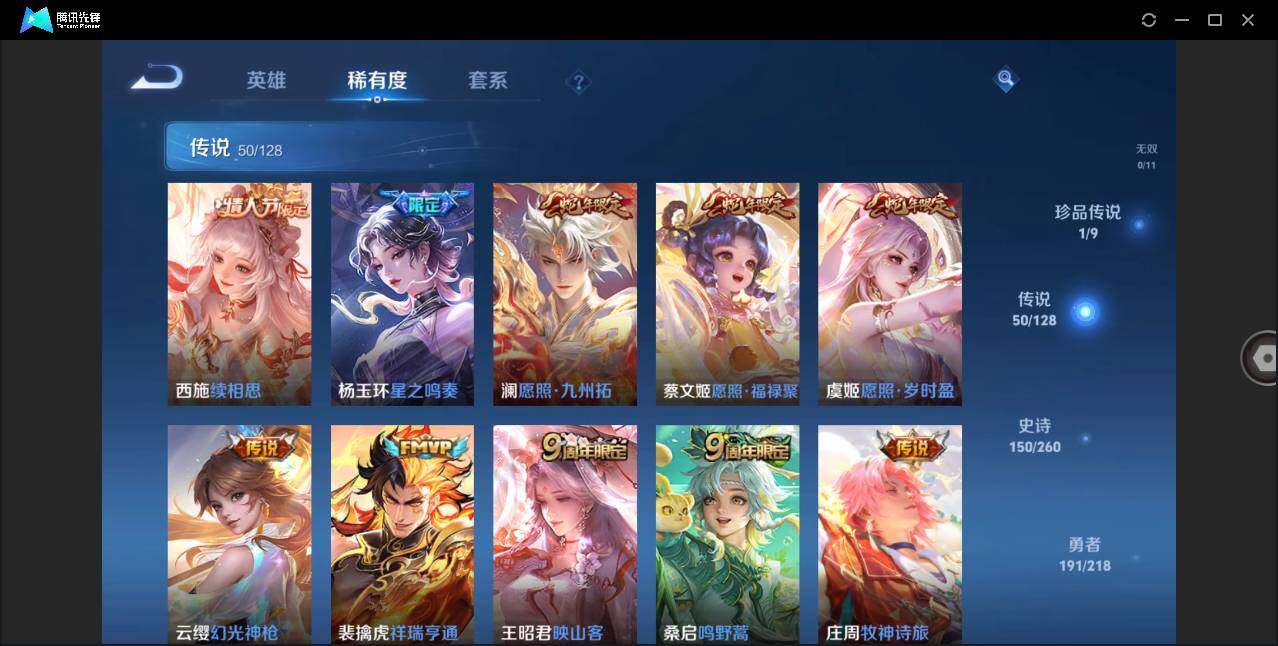 【传说皮肤】:狄仁杰超时空战士,孙悟空地狱火,孙尚香末日机甲,貂蝉仲夏夜之梦,诸葛亮武陵仙君,花木兰冠军飞将,虞姬云霓雀翎,干将莫邪久胜战神,张良黄金白羊座,刘备时之恋人,李信一念神魔,孙悟空零号赤焰,虞姬启明星使,镜炽阳神光,铠绛天战甲,诸葛亮时雨天司,曜李逍遥 ,西施游龙清影,赵云淬星耀世,孙尚香异界灵契,蔡文姬花朝如约,大乔挚爱花嫁,马超无双飞将,孙尚香音你闪耀,百里守约碎云,王昭君星穹之声,不知火舞绯月行,李白诗剑行,吕布怒海麟威,公孙离记忆之芯,宫本武藏惊梅引,甄姬至美化雀舞,露娜霜月吟,艾琳觅芳踪,澜逐花归海,孙策乘龙淬吴钩,典韦战鼓燎原,亚连落雪白狼,海月金乌负日,朵莉亚心动手记,庄周牧神诗旅,桑启鸣野蒿,王昭君映山客,裴擒虎祥瑞亨通,云缨幻光神枪,虞姬愿照岁时盈,蔡文姬愿照福禄聚,澜愿照九州拓,杨玉环星之鸣奏,西施续相思