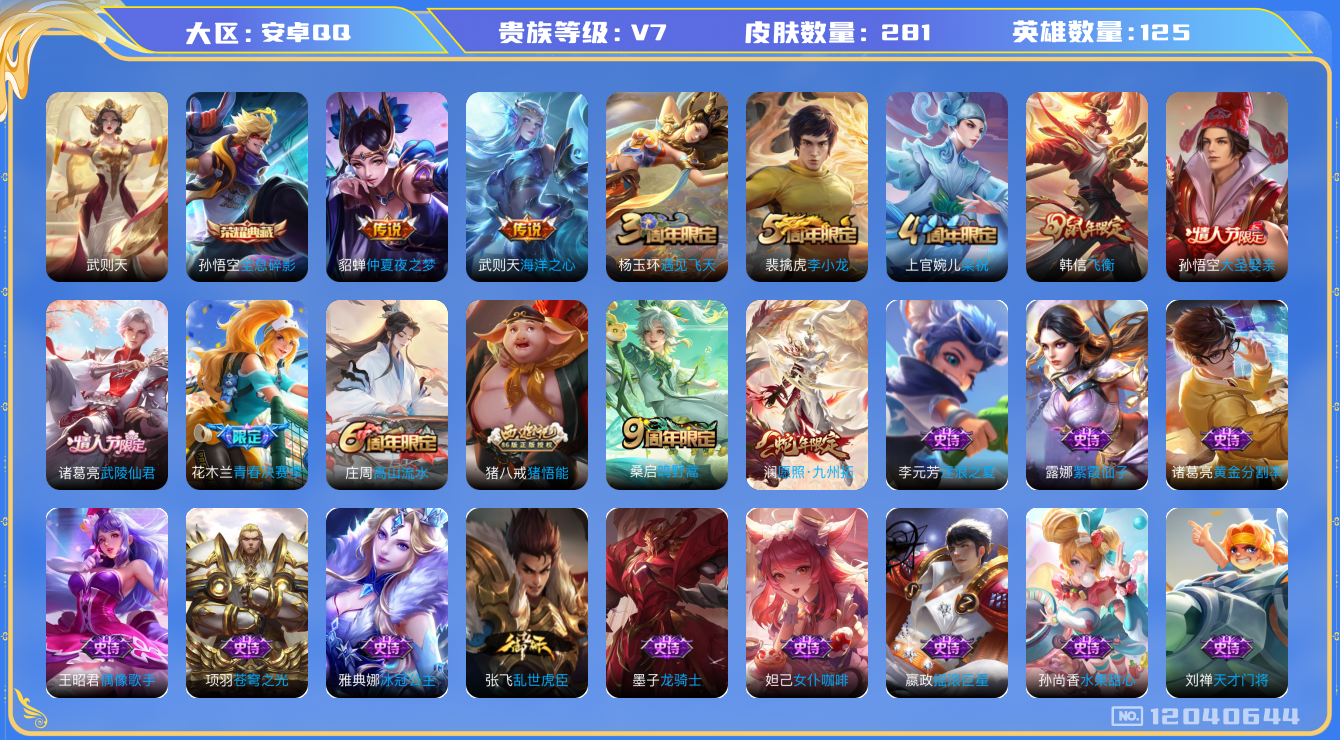 [12040644]【特价急出/详情看图】:安卓Q-V7-至尊星耀III段位-125英雄-281皮肤-1典藏-6传说-57史诗