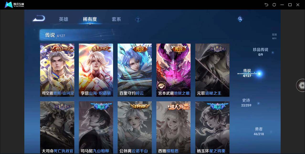 - PX_2093206-76 安卓QQ/至尊星耀/215皮肤/123英雄/0典藏/0珍品无双/0无双/0珍品传说/1传说/49史诗/7稀有英雄 【1 传说皮肤】幻光神枪 云缨, 【49 史诗皮肤】电玩小子 鲁班七号,高山流水 庄周,暗影游猎 马可波罗,德古拉伯爵 刘邦,心灵战警 亚瑟,五谷丰年 鬼谷子,无心 元歌,鬼剑武藏 宫本武藏,迷踪丽影 阿轲,星夜王子 白起,摇滚巨星 嬴政,修罗 橘右京,拒霜