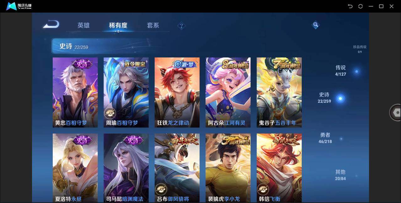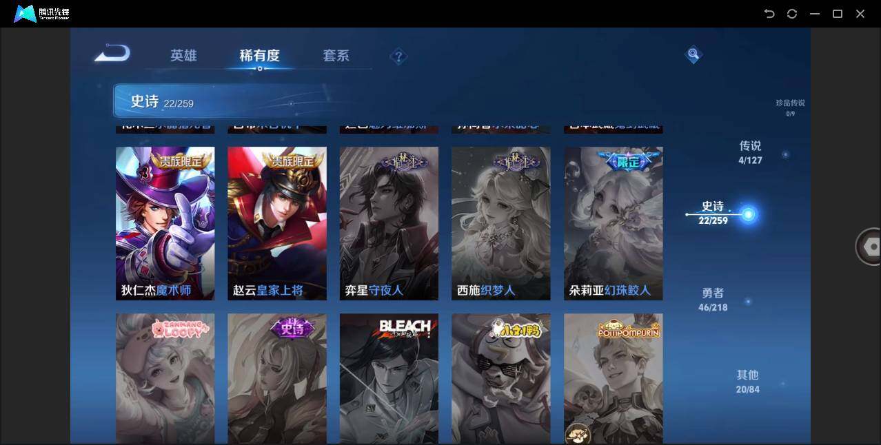 - PX_2104943-Q/至尊星耀/239皮肤/124英雄/2典藏/0珍品无双/0无双/2珍品传说/17传说/71史诗/8稀有英雄 【2 珍品传说】怪盗基德 马可波罗,时之奇旅 孙策, 【2 典藏皮肤】全息碎影 孙悟空,弑枪猎影 韩信, 【17 传说皮肤】启明星使 虞姬,李逍遥 曜,齐天大圣 孙悟空,燃星之曲 花木兰,鹤羽星尊 诸葛亮,时雨天司 诸葛亮,黄金射手座 后羿,时之奇旅 鲁班七号,时之