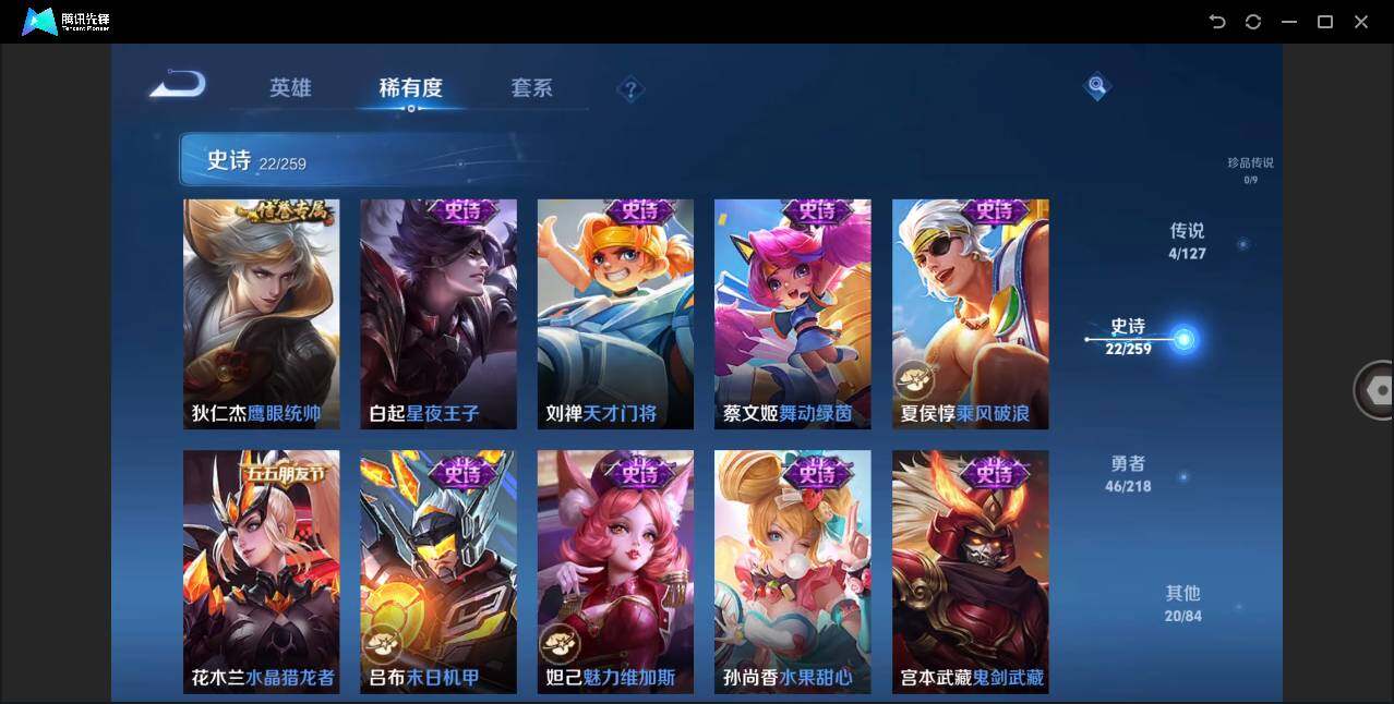 【史诗皮肤】:赵云皇家上将,狄仁杰魔术师,宫本武藏鬼剑武藏,孙尚香水果甜心,妲己魅力维加斯,吕布末日机甲,花木兰水晶猎龙者,夏侯惇乘风破浪,蔡文姬舞动绿茵,刘禅天才门将,白起星夜王子,狄仁杰鹰眼统帅,韩信飞衡,裴擒虎李小龙,吕布御风骁将,司马懿暗渊魔法,夏洛特永昼,鬼谷子五谷丰年,阿古朵江河有灵,狂铁龙之律动,周瑜百相守梦,黄忠百相守梦