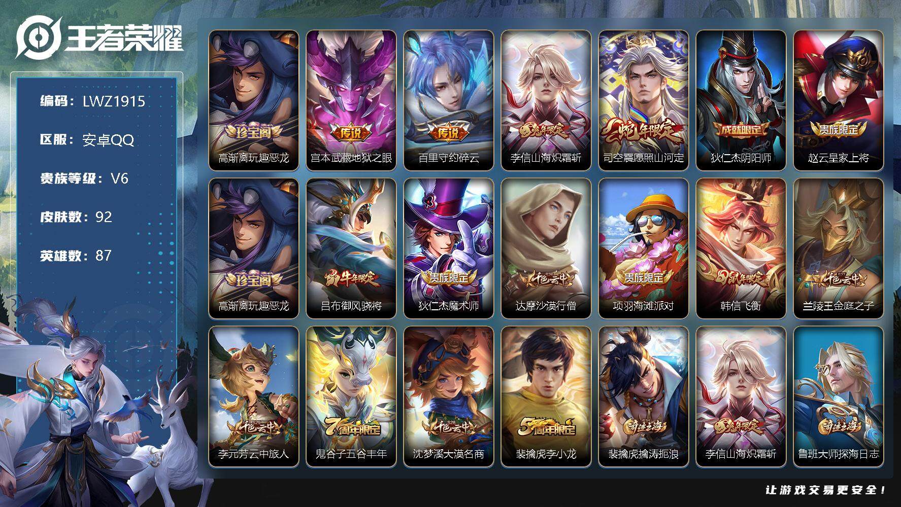 [12039669]【暑期末清货/特价急出/永久包赔】:安卓Q-V6-最强王者段位-87英雄-92皮肤-4传说-22史诗 【内测皮肤】:高渐离玩趣恶龙 【传说皮肤】:宫本武藏地狱之眼,百里守约碎云,李信山海炽霜斩,司空震愿照山河定 【限定皮肤】:狄仁杰阴阳师,赵云皇家上将,高渐离玩趣恶龙,吕布御风骁将,狄仁杰魔术师,达摩沙漠行僧,项羽海滩派对,韩信飞衡,兰陵王金庭之子,李元芳云中旅人,鬼谷子五谷丰年,沈梦溪大漠名商,裴擒虎李小龙,裴擒虎擒涛扼浪,李信山海炽霜斩,鲁班大师探海日志,桑启海盐诗旅,阿古朵江河有灵,张良古海寻踪,鬼谷子天穹祈灯 【年限皮肤】:吕布御风骁将,韩信飞衡,李信山海炽霜斩 【赛季限定】:达摩沙漠行僧,兰陵王金庭之子,张良古海寻踪,李元芳云中旅人,沈梦溪大漠名商,裴擒虎擒涛扼浪,鲁班大师探海日志,桑启海盐诗旅,鬼谷子天穹祈灯 【史诗皮肤】:赵云皇家上将,狄仁杰魔术师,宫本武藏鬼剑武藏,孙尚香水果甜心,妲己魅力维加斯,吕布末日机甲,花木兰水晶猎龙者,夏侯惇乘风破浪,蔡文姬舞动绿茵,刘禅天才门将,白起星夜王子,狄仁杰鹰眼统帅,韩信飞衡,裴擒虎李小龙,吕布御风骁将,司马懿暗渊魔法,夏洛特永昼,鬼谷子五谷丰年,阿古朵江河有灵,狂铁龙之律动,周瑜百相守梦,黄忠百相守梦 【其他皮肤】:项羽海滩派对,韩信教廷特使,韩信街头霸王,白起白色死神,扁鹊救世之瞳,安琪拉玩偶对对碰,妲己少女阿狸,典韦黄金武士,亚瑟死亡骑士,花木兰兔女郎,狄仁杰阴阳师,刘备纽约教父,刘备汉昭烈帝,钟无艳海滩丽影,王昭君幻想奇妙夜,老夫子功夫老勺,孙尚香沉稳之力,大乔守护之力,吕布野性能量,高渐离玩趣恶龙,达摩沙漠行僧,兰陵王金庭之子,沈梦溪大漠名商,李元芳云中旅人,桑启海盐诗旅,猪八戒潮玩探月行,裴擒虎擒涛扼浪,太乙真人劲辣红锅,鲁班大师探海日志,张良古海寻踪,钟无艳聚星闪耀,亚连破局者,鬼谷子天穹祈灯,苍苍林狼骑,太乙真人谧流熔炉,典韦铁骨偃魂,西施雪境奇遇,明世隐景韶洛都,戈娅玫蓝誓约,刘备浪漫序章,钟馗虚灵犬护,苏烈春野闲踪,张良灵野札记,阿古朵布丁狗之约,露娜命运加冕,孙策百相守梦,老夫子潮流仙人,曹操超能战警,孙悟空西部大镖客,后羿精灵王,兰陵王隐刃,李白范海辛,李元芳特种部队,马可波罗激情绿茵,杨戬埃及法老,铠龙域领主,百里玄策威尼斯狂欢,元歌午夜歌剧院,孙策海之征途,司马懿魇语军师,伽罗花见巫女
