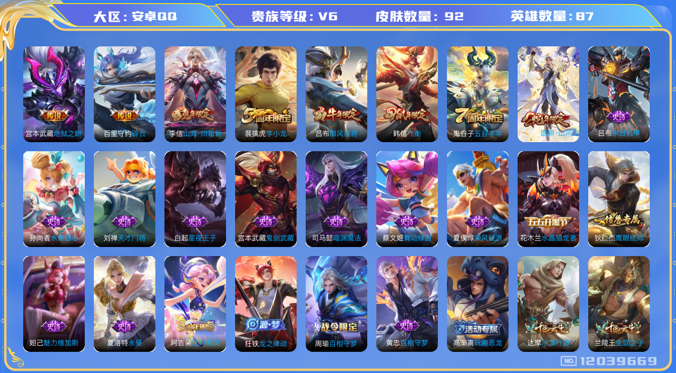 - [12267040]V8 1典藏 14传说 125英雄 296皮肤 可修改实名 优质装备:九霄神辉(木兰典藏),黄金狮子座,冠军飞将,黄金白羊座,末日机甲-孙尚香(绿蚂蚱),地狱火,仲夏夜之梦(大飞蛾),地狱之眼 传说皮:幻光神枪 珍宝阁皮:女武神,玩趣恶龙 限定皮:愿照·岁时盈(虞姬年限),愿照·众生和(妲己年限),鸣野蒿,至尊宝,白虎志(电光耗子),凤求凰(白切鸡),白鹤梁神女,瑞麟志(木兰年限),高山流水,五谷丰年,青龙志(铠年限),冰锋战神,梁祝,天狼狩猎者,天狼溯光者,逐梦之音,天狼征服者,奔雷神使(牛魔年限),逐梦之影,玄武志(苏烈年限),朱雀志(守约年限),猪悟能,引擎之心,冰霜恋舞曲,神奇女侠 史诗皮:苍鳞隐世,器灵·浮梦炉,龙之律动,茶境仙,蒙犽顽岩魄,星界特工,炽弈燎原,破空之剑,涂山红红,东方月初,芈月浮光幕影,星界战将,紫霞仙子,白龙吟,黄金分割率,特工魅影,千年之狐,江河有灵,龙骑士(小龙虾),百解令(蒙犽),蒙恬荣光圣徽,晚萤,魅语,无限星赏官,青蛇,偶像歌手,末日机甲-吕布,猫狗日记-孙策,猫狗日记-大乔,乱世虎臣,节奏热浪,女仆咖啡,摇滚巨星,水果甜心,星夜王子,心灵骇客,功夫厨神,德古拉伯爵,暗隐猎兽者,幽灵船长,鬼剑武藏,心灵战警,舞动绿茵,地狱岩魂,拒霜思,缤纷独角兽,乘风破浪,逐浪之夏,月团寄思,水晶猎龙者,曙光守护者,金属风暴,原初追逐者,圣诞狂欢,圣诞恋歌,鹰眼统帅,魅力维加斯,黎明之约,未来纪元-赵云