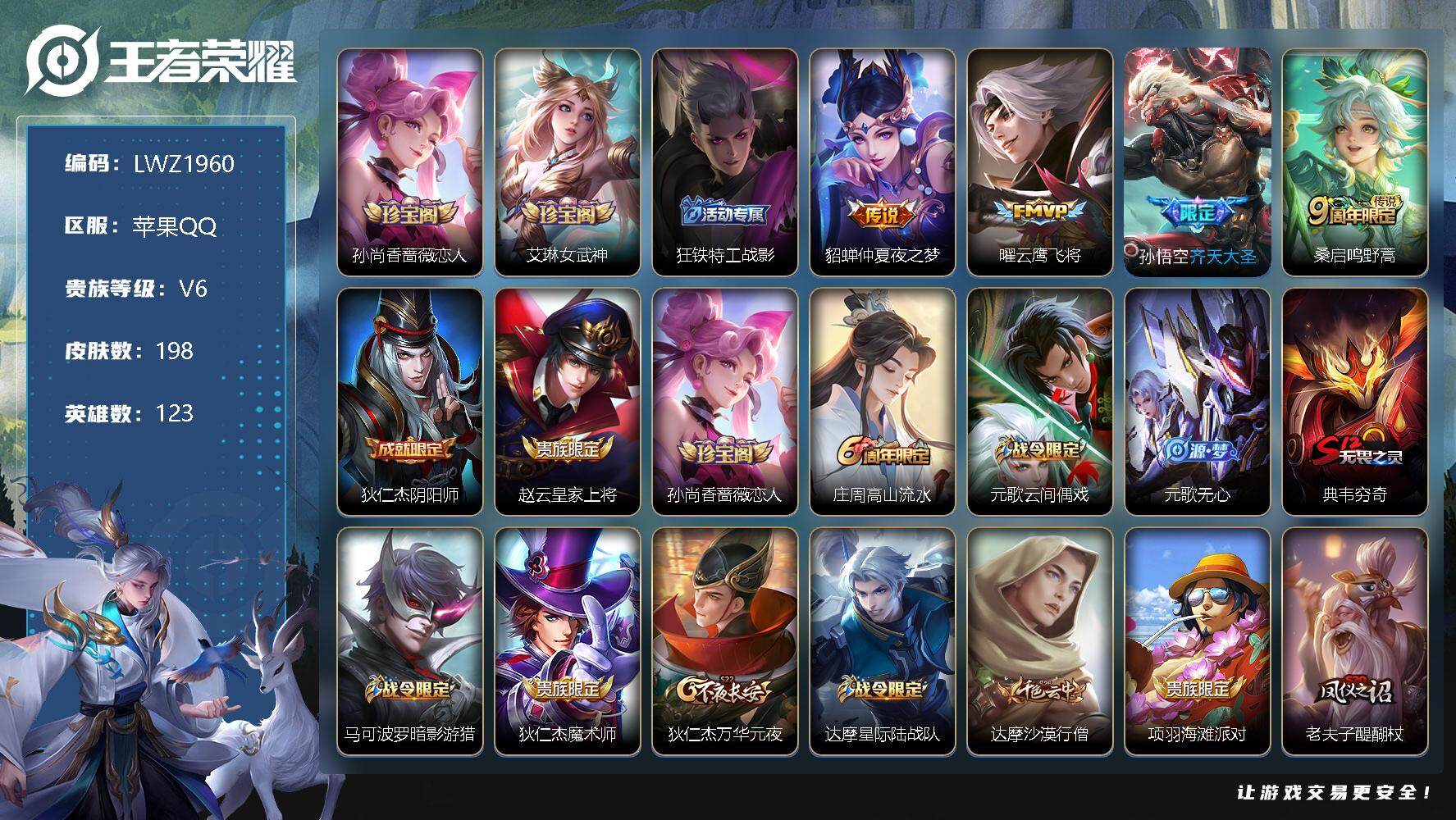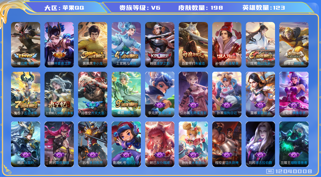 [12040008]【暑期末清货/特价急出/永久包赔】:苹果Q-V6-至尊星耀V段位-123英雄-198皮肤-4传说-58史诗