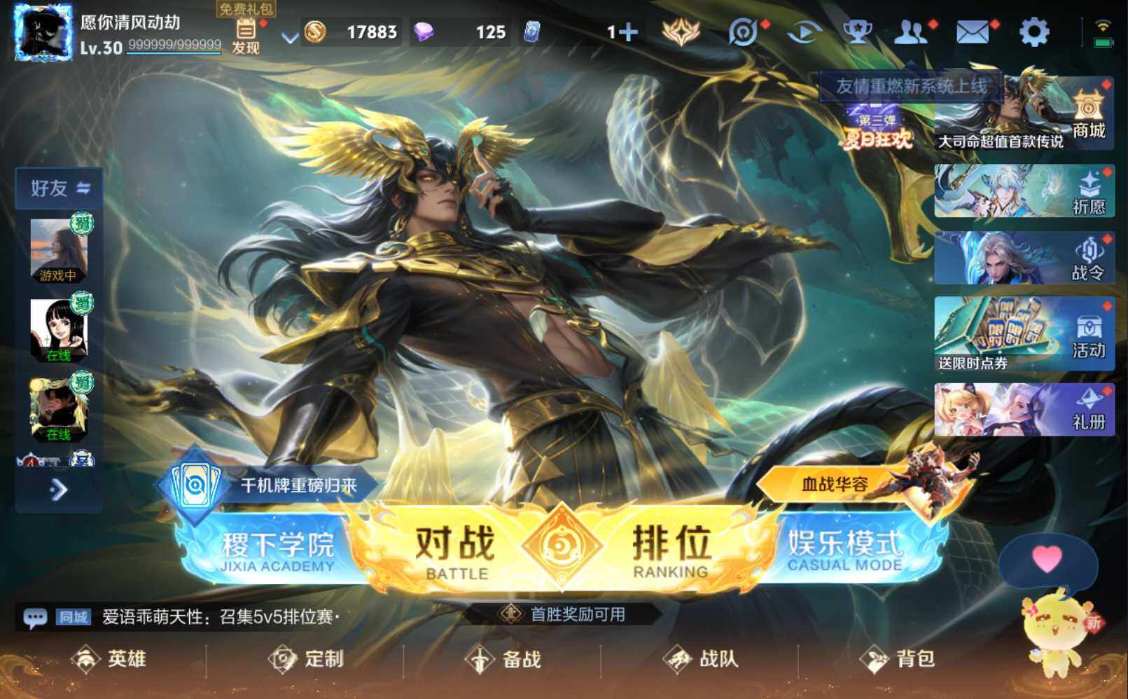 - [11681546]V8 1典藏 24传说 125英雄 269皮肤 可修改实名 优质装备:鸣剑·曳影,黄金狮子座,黄金射手座,冠军飞将,云鹰飞将(小将军),黄金白羊座,久胜战神,炽阳神光,一念神魔,末日机甲-孙尚香(绿蚂蚱),胖达荣荣,李逍遥,时之恋人-刘备(电焊工),游龙清影(小青龙),淬星耀世,超时空战士-狄仁杰,末日机甲-孙策 传说皮:幻光神枪 珍宝阁皮:妄想食味,万物之道,优雅恋人 限定皮:愿照·九州拓(澜年限),鸣野蒿,武陵仙君(小桃花),傲雪梅枪,白鹤梁神女,神威(电光马子),遇见飞天,高山流水,五谷丰年,天狼溯光者,祈雪灵祝(雪兔子),天狼绘梦者,李小龙,逐梦之影,朱雀志(守约年限),真爱至上,一生所爱,青春决赛季,冰霜恋舞曲,蜜橘之夏,寅虎·瑞焰(虎皮蛋子),寅虎·赤拳(老虎年限) 史诗皮:化蝶舞,星界战将,龙之律动,海诺心动手记,破空之剑,蒙犽顽岩魄,谪仙醉月,蔬乡物语(鲁班七号),百相守梦-黄忠,电玩小子(小书包),特工魅影,千年之狐,永昼,偶像歌手,魅语,晚萤,冰冠公主,末日机甲-吕布,猫狗日记-孙策,猫狗日记-大乔,时之恋人-孙尚香,节奏热浪,修罗,水果甜心,星夜王子,心灵骇客,功夫厨神,鬼剑武藏,天秀·启明,地狱岩魂,诗语江南,纤云弄巧,缤纷独角兽,水晶猎龙者,曙光守护者,箭羽风息,原初追逐者,圣诞恋歌,鹰眼统帅,暗夜贵公子,魅力维加斯,黎明之约,未来纪元-赵云