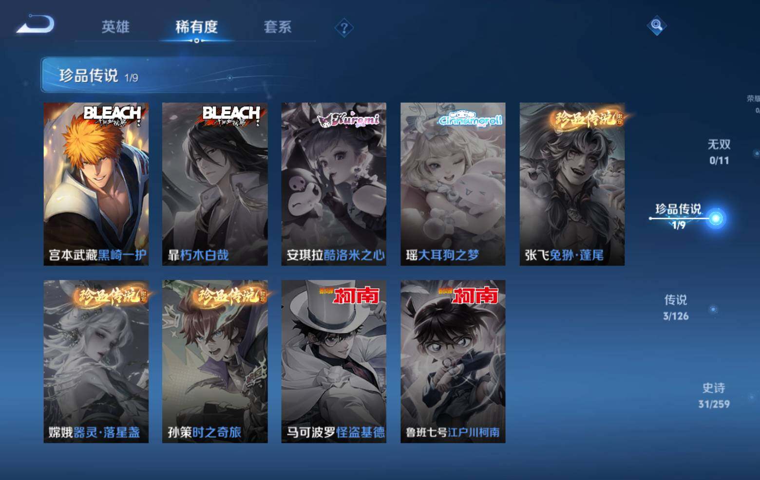 曹操烛龙,芈月重明,典韦穷奇,狂铁御狮,米莱狄御霄,牛魔御旌,盾山御銮,夏侯惇朔风刀,明世隐疑决卦,老夫子醍醐杖,鬼谷子原初探秘者,狄仁杰万华元夜,程咬金演武夺筹,钟馗驱傩正仪,苏烈千军破阵,弈星混沌棋,达摩沙漠行僧,兰陵王金庭之子,沈梦溪大漠名商,李元芳云中旅人,桑启海盐诗旅,裴擒虎擒涛扼浪,鲁班大师探海日志,张良古海寻踪