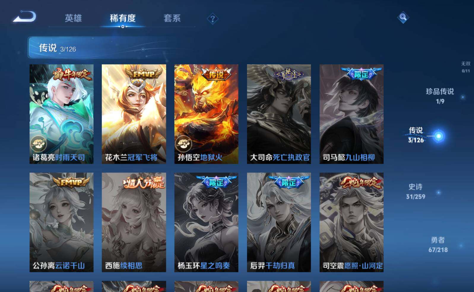 【传说皮肤】:孙悟空地狱火,花木兰冠军飞将,诸葛亮时雨天司
