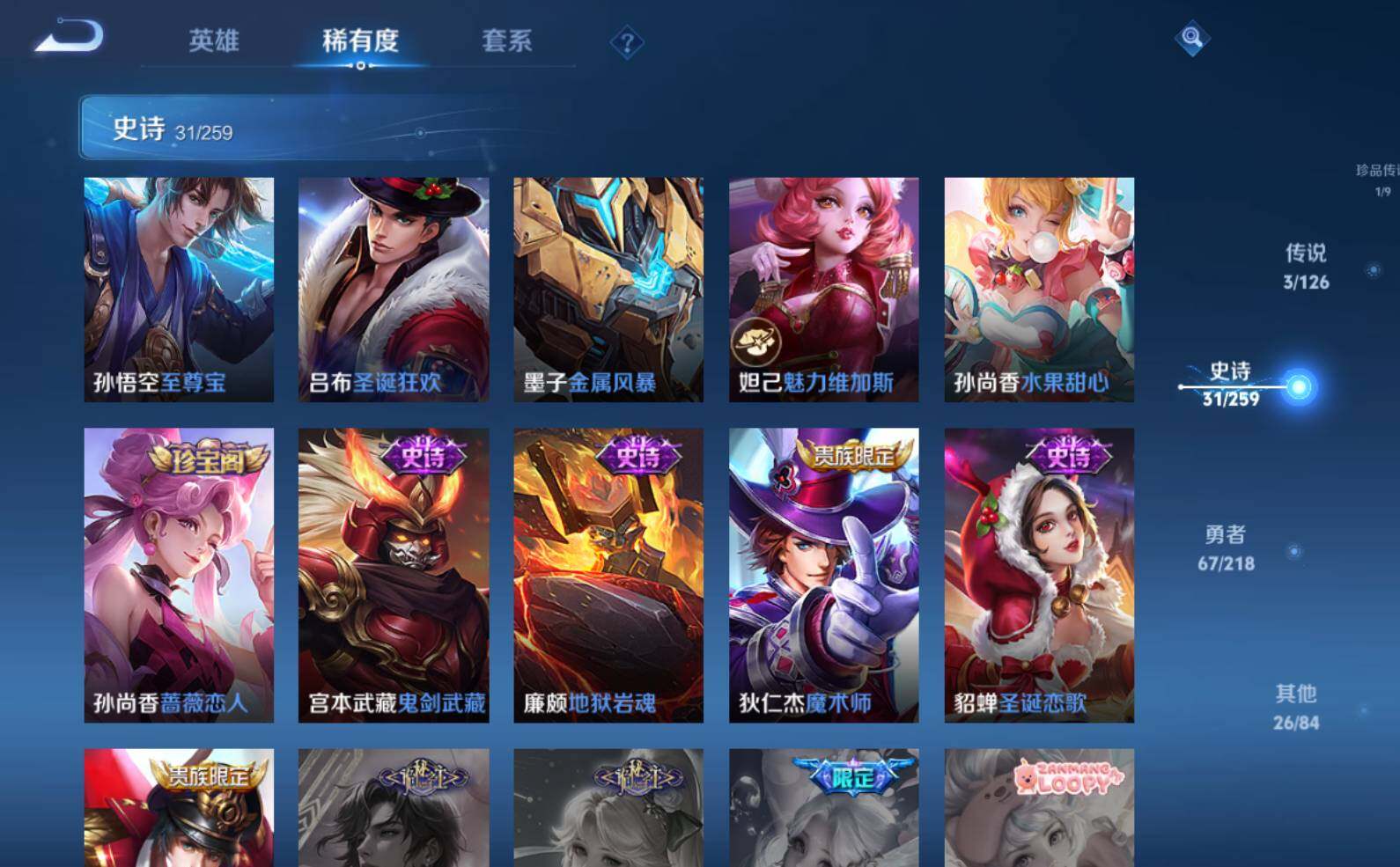 【史诗皮肤】:赵云皇家上将,貂蝉圣诞恋歌,狄仁杰魔术师,廉颇地狱岩魂,宫本武藏鬼剑武藏,孙尚香蔷薇恋人,孙尚香水果甜心,妲己魅力维加斯,墨子金属风暴,吕布圣诞狂欢,孙悟空至尊宝,夏侯惇乘风破浪,兰陵王暗隐猎兽者,李元芳逐浪之夏,程咬金功夫厨神,干将莫邪冰霜恋舞曲,孙悟空大圣娶亲,狄仁杰鹰眼统帅,上官婉儿梁祝,大乔白蛇,橘右京修罗,百里玄策原初追逐者,裴擒虎李小龙,云中君纤云弄巧,庄周高山流水,雅典娜黎明之约,鬼谷子五谷丰年,元歌无心,梦奇顽趣,狂铁龙之律动,黄忠百相守梦