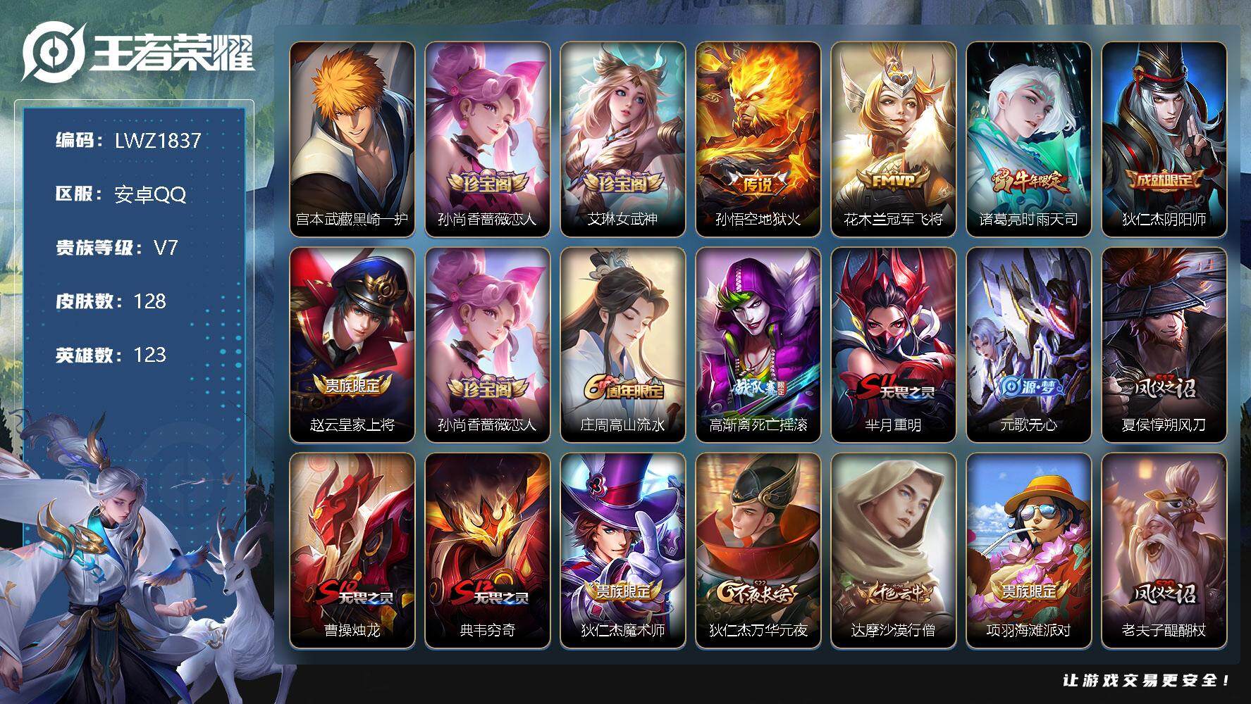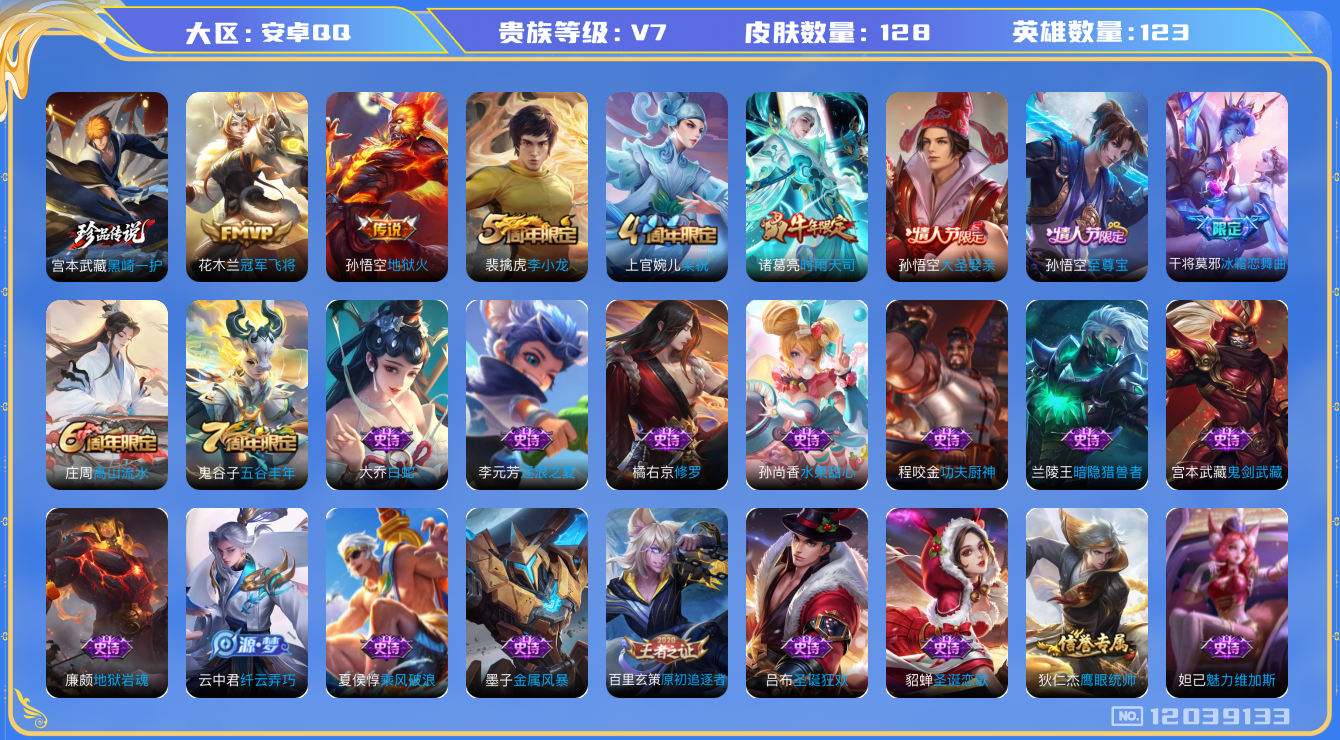 [12039133]暑期末清货/特价急出/永久包赔【商品标题】:安卓Q-V67至尊星耀II段位-123英雄-128皮肤-0典藏-0珍品无双-0无双-1珍品传说-3传说-31史诗