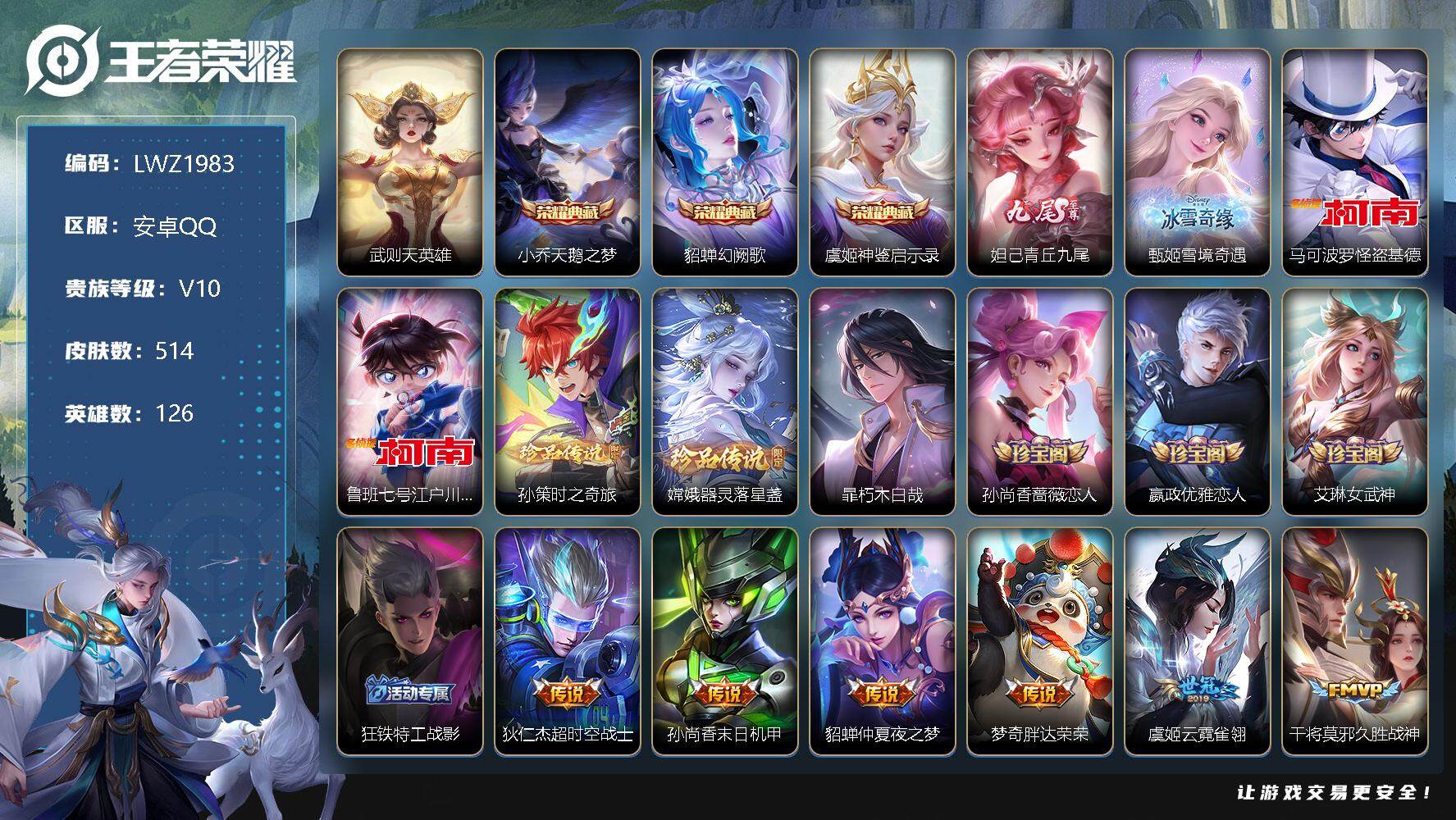 [12040158]中路39段【暑期末清货/特价急出/永久包赔】:安卓Q-V10-最强王者段位-126英雄-514皮肤-3典藏-2无双-5珍品传说-49传说-170史诗 【荣耀典藏】:武则天英雄,小乔天鹅之梦,貂蝉幻阙歌,虞姬神鉴启示录 【无双皮肤】:妲己青丘九尾,甄姬雪境奇遇 【珍品传说】:马可波罗怪盗基德,鲁班七号江户川柯南,孙策时之奇旅,嫦娥器灵落星盏,暃朽木白哉 【内测皮肤】:孙尚香蔷薇恋人,嬴政优雅恋人,艾琳女武神,狂铁特工战影 【传说皮肤】:狄仁杰超时空战士,孙尚香末日机甲,貂蝉仲夏夜之梦,梦奇胖达荣荣,虞姬云霓雀翎,干将莫邪久胜战神,貂蝉猫影幻舞,虞姬启明星使,镜炽阳神光,兰陵王默契交锋,小乔音你心动,曜李逍遥 ,西施游龙清影,王昭君乞巧织情,貂蝉遇见胡旋,女娲补天,孙尚香音你闪耀,王昭君星穹之声,不知火舞绯月行,李信山海炽霜斩,小乔山海琳琅生,花木兰燃星之曲,干将莫邪画中仙,夏洛特浮生妄,公孙离记忆之芯,安琪拉追逃游戏,诸葛亮鹤羽星尊,上官婉儿妄想奇谈,云缨鹤归松栖,宫本武藏惊梅引,大乔时之奇旅,王昭君永恒水手月亮,孙膑小动物乐团,露娜霜月吟,艾琳觅芳踪,孙尚香乘龙问璇玑,貂蝉曦玄引,海月金乌负日,庄周牧神诗旅,桑启鸣野蒿,王昭君映山客,嬴政玄雷天君,云缨幻光神枪,虞姬愿照岁时盈,妲己愿照众生和,女娲愿照千秋盛,杨玉环星之鸣奏,西施续相思,公孙离云诺千山 【限定皮肤】:白起狰,蒙犽顽岩魄,蔡文姬夏日便利店,大乔绒语心约,虞姬夏日便利店,姜子牙天穹之誓,杨戬破阵退雄兵,李白谪仙醉月,狄仁杰阴阳师,虞姬凯尔特女王,小乔山海琳琅生,赵云皇家上将,赵云引擎之心,墨子神迹守卫,妲己热情桑巴,妲己时之彼端,妲己时之奇旅,嬴政优雅恋人,孙尚香蔷薇恋人,庄周高山流水,阿轲迷踪丽影,钟无艳超时空战士,扁鹊炼金王,扁鹊奇幻香踪,白起夜都怪侠,芈月白晶晶,芈月幻夜卜梦,吕布御风骁将,周瑜赤莲之焰,元歌云间偶戏,元歌无心,夏侯惇朔风刀,甄姬女儿国国王,甄姬游园惊梦,甄姬落雪兰心,典韦穷奇,典韦蓝屏警告,马可波罗暗影游猎,马可波罗山海玄木吟,狄仁杰魔术师,狄仁杰万华元夜,达摩沙漠行僧,项羽海滩派对,老夫子醍醐杖,老夫子航海奇遇记,貂蝉逐梦之音,貂蝉遇见胡旋,安琪拉魔法小厨娘,安琪拉追逃游戏,程咬金演武夺筹,露娜一生所爱,刘邦夺宝奇兵,韩信傲雪梅枪,王昭君凤凰于飞,王昭君午后时光,王昭君星穹之声