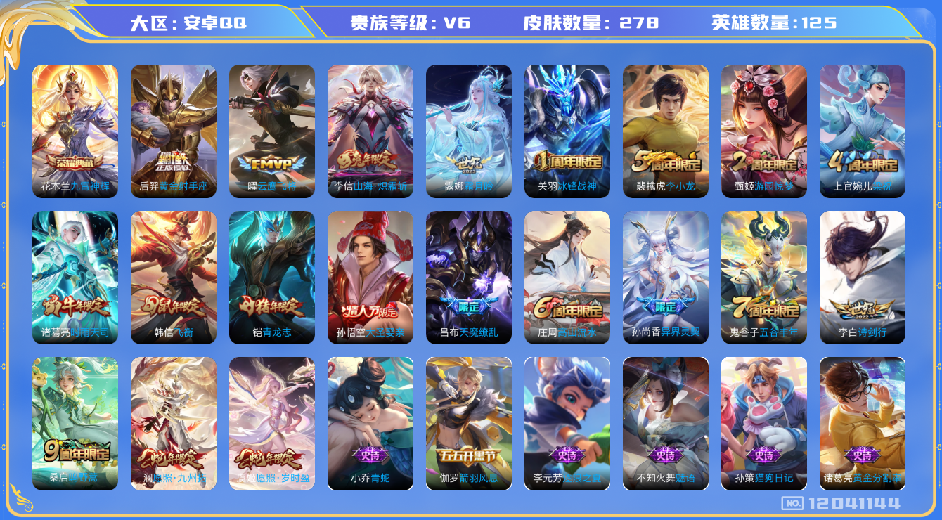 [12041144]【特价急出/详情看图】:安卓Q-V6-至尊星耀I段位-125英雄-278皮肤-1典藏-11传说-78史诗