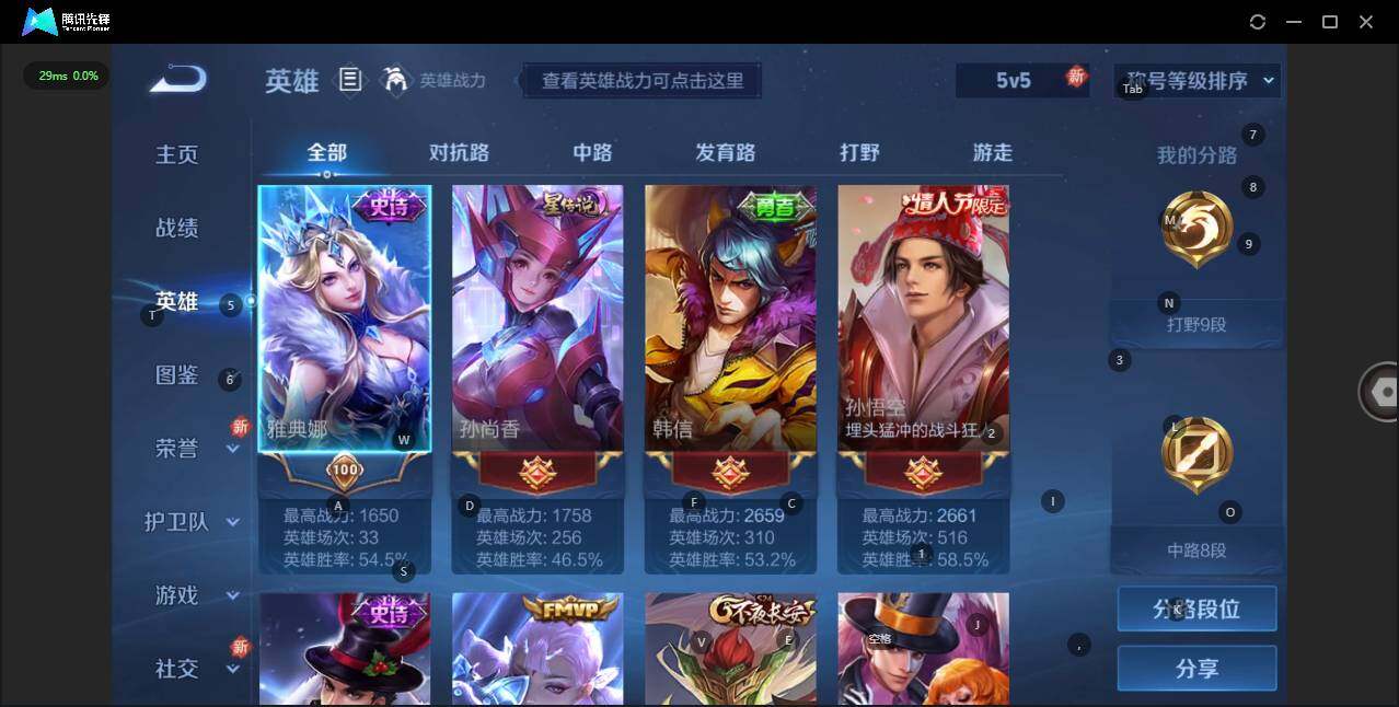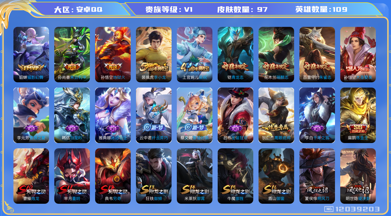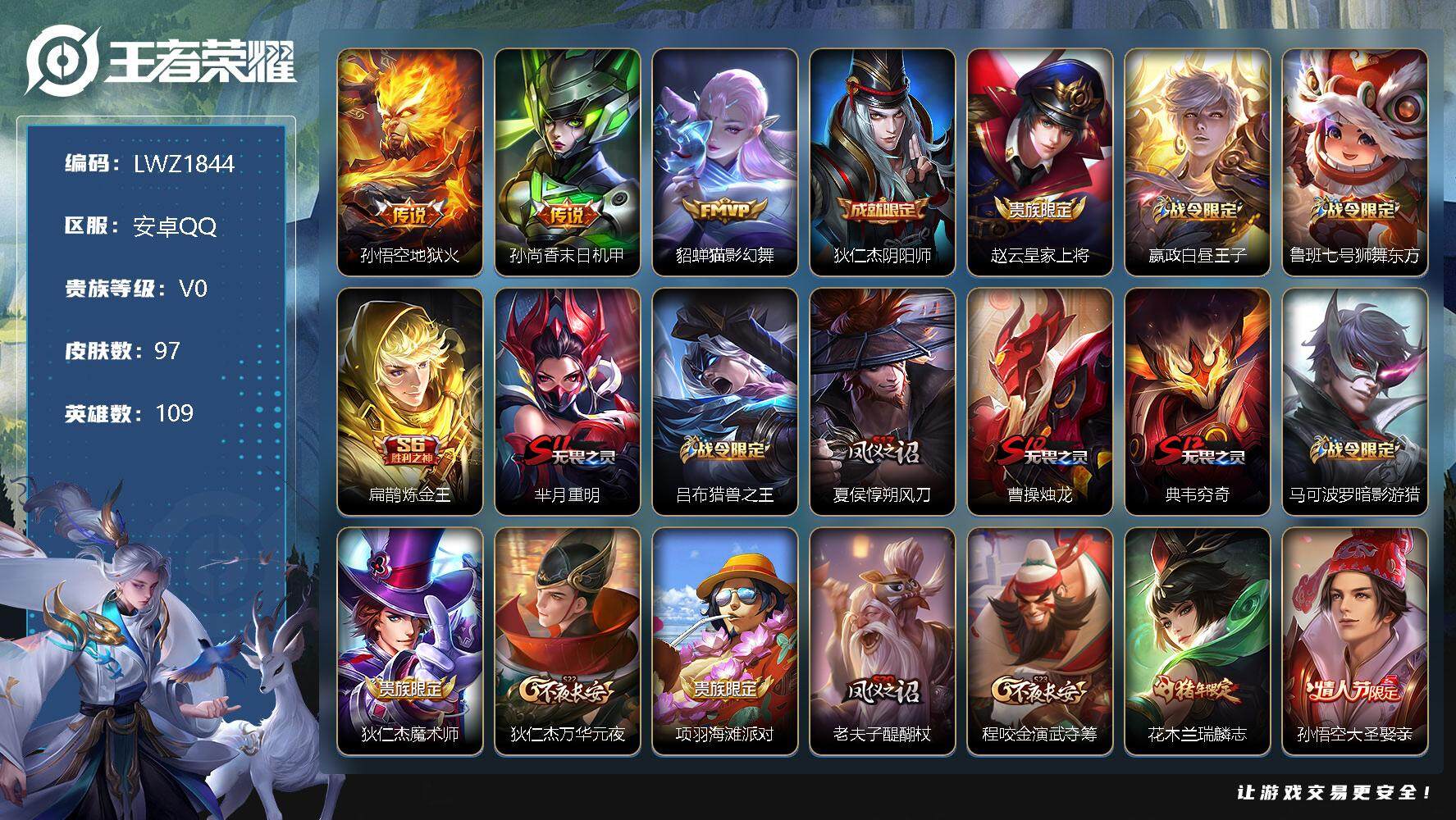 [12039203]【暑期末清货/特价急出/永久包赔/商品详情看图】:安卓Q-V0-荣耀黄金IV段位-109英雄-97皮肤-3传说-19史诗