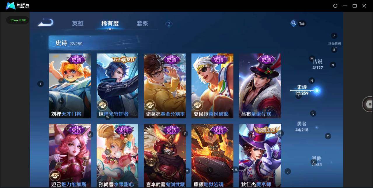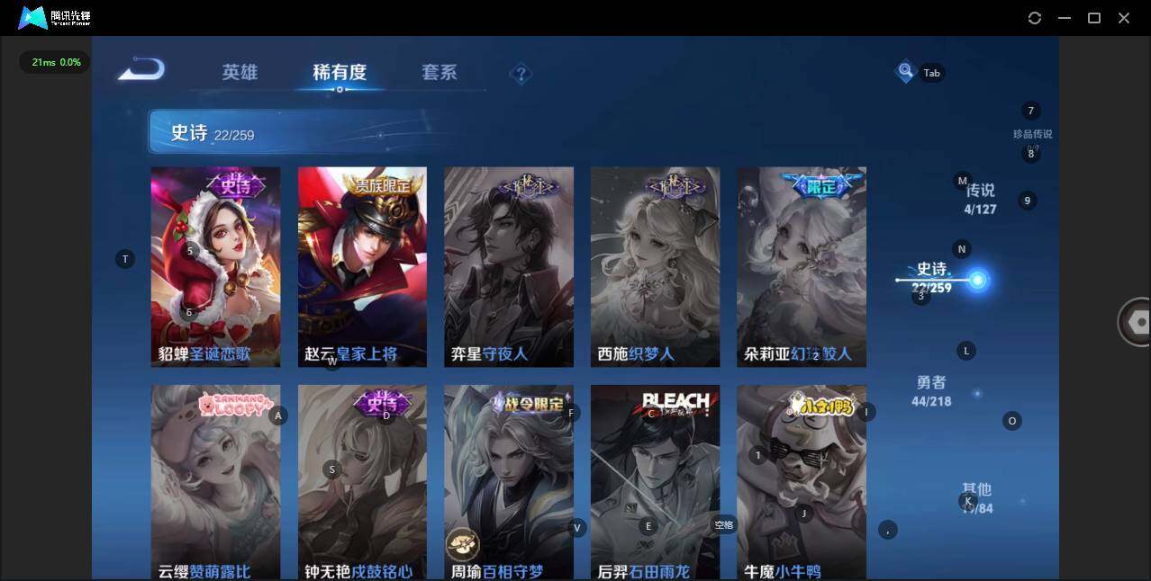 - PX_2095965-贵族等级: V9 英雄数: 124 皮肤数: 265 荣耀水晶: 天鹅之梦,幻阙歌,拾光映像,最初的交响 无双皮: 真我赫兹(瑶),小乔时之魔女 珍品传说: 怪盗基德 星传说: 时之愿境,金色仲夏夜,星际治安官 传说皮: 云鹰飞将,仲夏夜之梦,音你心动-周瑜,乞巧织情,游龙清影,碎云,记忆之芯,妄想奇谈,大乔-时之奇旅,幻光神枪 限定皮: 祈雪灵祝,时之彼端,乒乒小将,孙行者