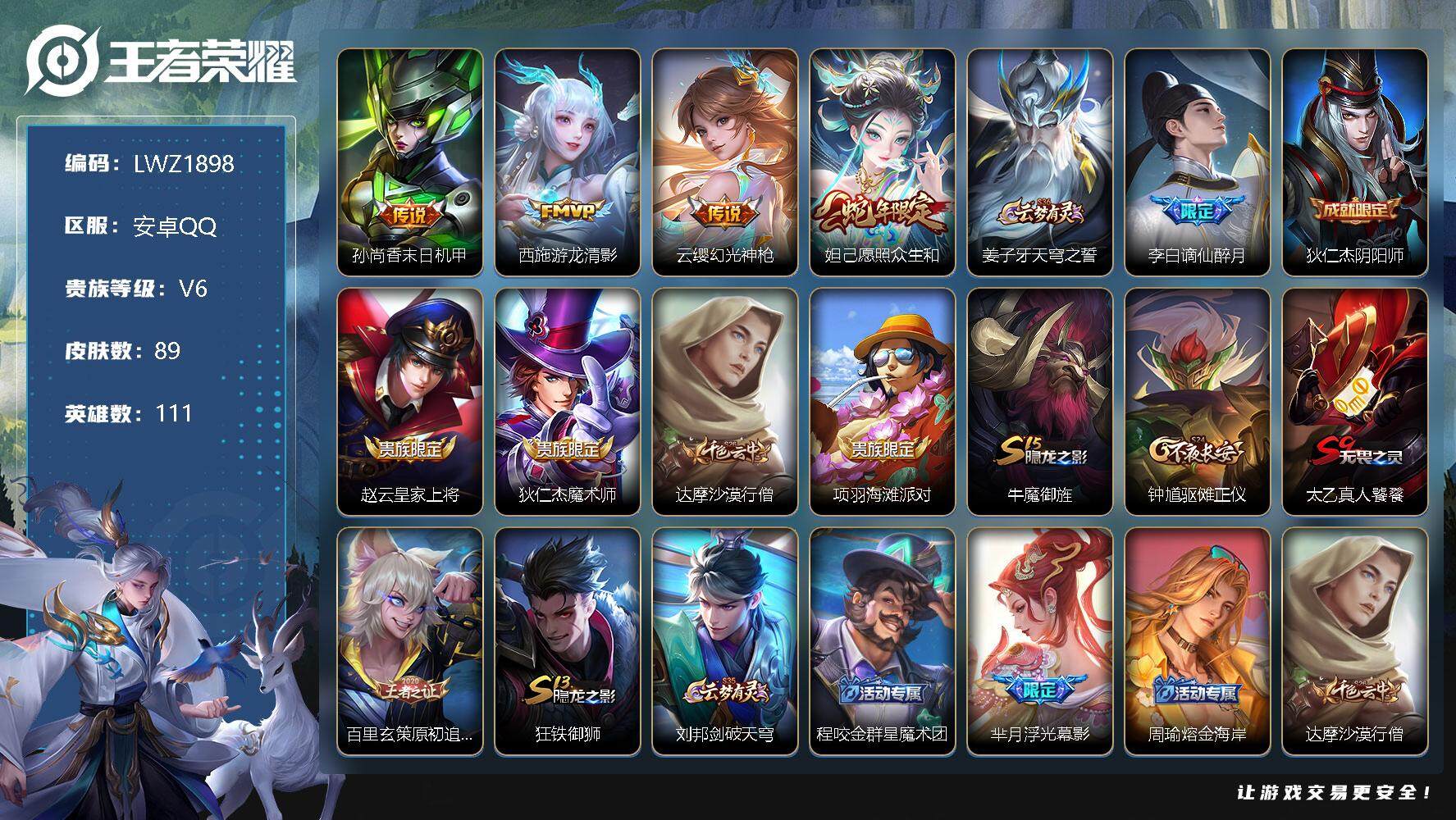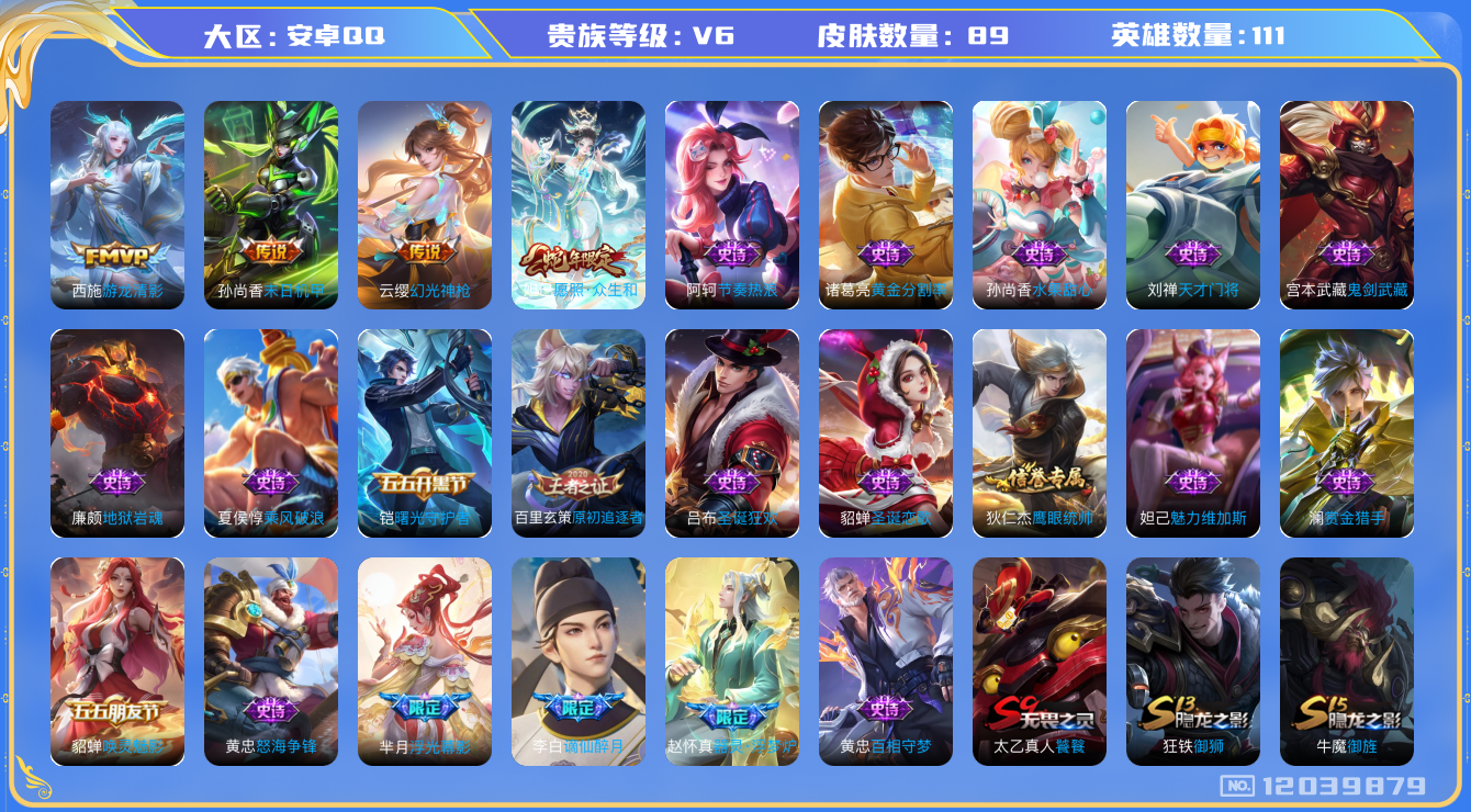 [12039879]【暑期末清货/特价急出/永久包赔】:安卓Q-V6-最强王者段位-111英雄-89皮肤-4传说-22史诗