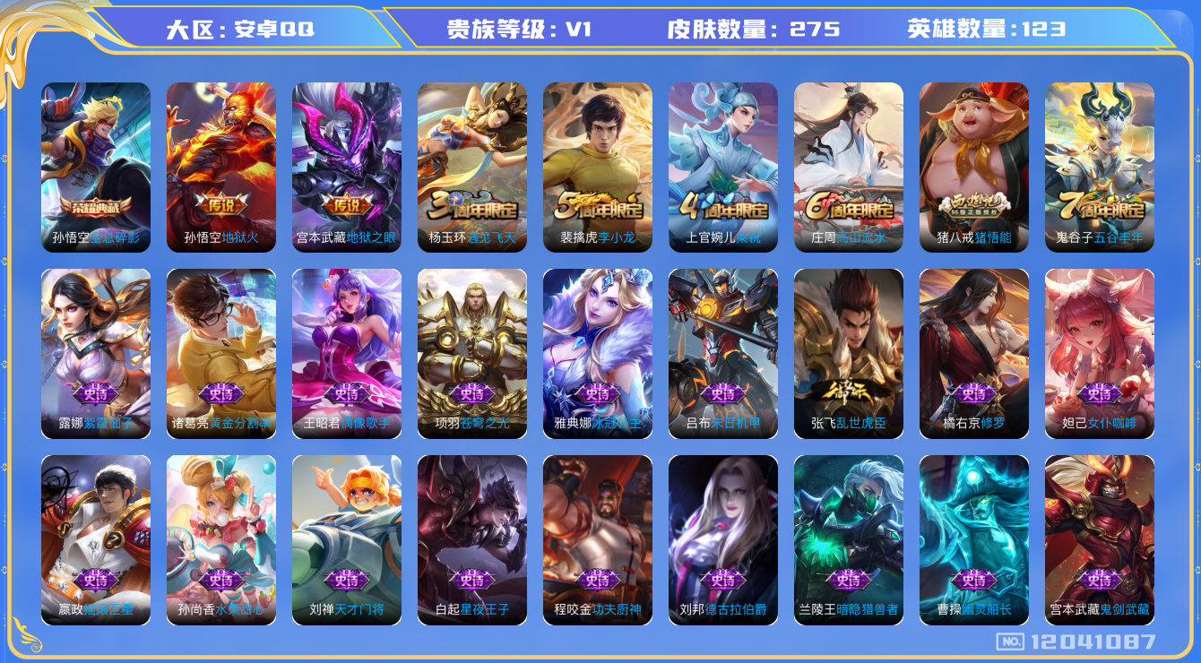 [12041087]【特价急出/详情看图】:安卓Q-V0-最强王者段位-123英雄-275皮肤-1典藏-2传说-61史诗