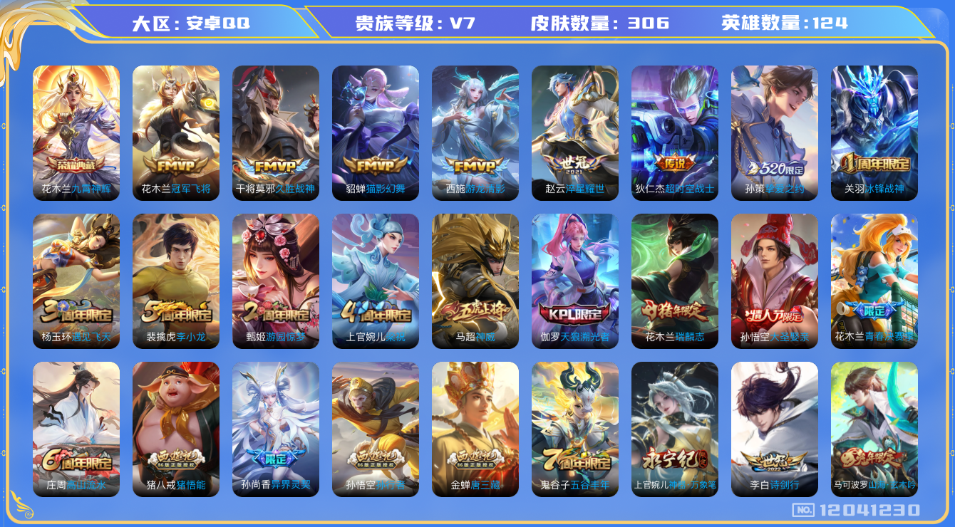 [12041230]游走48段/发育路46段【特价急出/详情看图】:安卓Q-V7-最强王者段位-124英雄-306皮肤-1典藏-10传说-87史诗 【荣耀典藏】:花木兰九霄神辉 【传说皮肤】:桑启鸣野蒿,李白诗剑行,孙策挚爱之约,孙尚香异界灵契,赵云淬星耀世,西施游龙清影,貂蝉猫影幻舞,干将莫邪久胜战神,花木兰冠军飞将,狄仁杰超时空战士 【限定皮肤】:姜子牙天穹之誓,狄仁杰阴阳师,赵云皇家上将,墨子神迹守卫,嬴政优雅恋人,嬴政白昼王子,孙尚香异界灵契,鲁班七号狮舞东方,庄周高山流水,高渐离死亡摇滚,钟无艳王者之锤,钟无艳超时空战士,白起夜都怪侠,芈月幻夜卜梦,吕布猎兽之王,周瑜赤莲之焰,元歌无心,夏侯惇朔风刀,甄姬游园惊梦,甄姬落雪兰心,典韦穷奇,典韦蓝屏警告,马可波罗山海玄木吟,狄仁杰魔术师,狄仁杰万华元夜,达摩沙漠行僧,项羽海滩派对,老夫子醍醐杖,老夫子航海奇遇记,关羽冰锋战神,程咬金演武夺筹,王昭君午后时光,兰陵王驯魔猎人,兰陵王金庭之子,花木兰青春决赛季,花木兰瑞麟志,孙悟空大圣娶亲,孙悟空孙行者,牛魔御旌,后羿圣弓游侠,李元芳银河之约,李元芳云中旅人,钟馗神迹守卫,钟馗驱傩正仪,杨玉环遇见飞天,女娲朔望之晖,干将莫邪真爱魔法,雅典娜黎明之约,蔡文姬繁星吟游,太乙真人华丽摇滚,鬼谷子原初探秘者,鬼谷子五谷丰年,黄忠火炮绅士,苏烈千军破阵,百里玄策原初追逐者,弈星混沌棋,梦奇顽趣,沈梦溪星空之诺,沈梦溪大漠名商,明世隐疑决卦,明世隐吟游魔法,裴擒虎李小龙,裴擒虎擒涛扼浪,狂铁御狮,狂铁电玩高手,米莱狄御霄,云中君纤云弄巧,伽罗天狼溯光者,盾山御銮,孙策挚爱之约,猪八戒猪悟能,上官婉儿梁祝,上官婉儿神器万象笔,嫦娥拒霜思,嫦娥暖冬兔眠,鲁班大师探海日志,桑启海盐诗旅,金蝉唐三藏,暃星界游侠,艾琳女武神,阿古朵江河有灵,张良古海寻踪,蒙恬荣光圣徽,鬼谷子天穹祈灯,周瑜熔金海岸 【年限皮肤】:花木兰瑞麟志,马超神威,马可波罗山海玄木吟 【赛季限定】:夏侯惇朔风刀,典韦穷奇,狄仁杰万华元夜,达摩沙漠行僧,老夫子醍醐杖,程咬金演武夺筹,兰陵王金庭之子,张良古海寻踪,牛魔御旌,李元芳云中旅人,钟馗驱傩正仪,雅典娜黎明之约,鬼谷子原初探秘者,苏烈千军破阵,百里玄策原初追逐者,弈星混沌棋,梦奇顽趣,沈梦溪大漠名商,明世隐疑决卦,裴擒虎擒涛扼浪,狂铁御狮,米莱狄御霄,盾山御銮,鲁班大师探海日志,