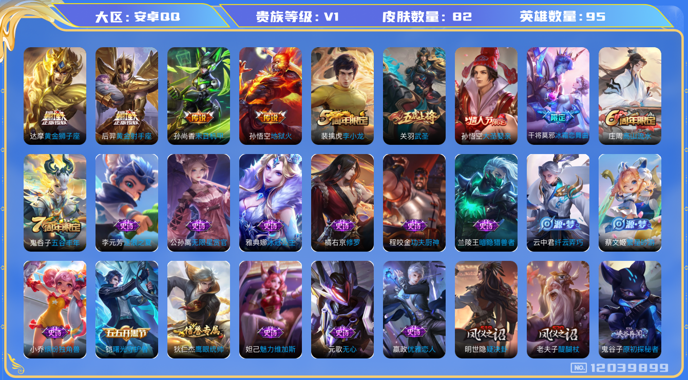 - [12297181]V8 1典藏 15传说 125英雄 319皮肤 可修改实名 优质装备:鸣剑·曳影,黄金狮子座,云鹰飞将(小将军),绛天战甲(鸡嘴战神),猫影幻舞,久胜战神,一念神魔,地狱火,零号·赤焰,地狱之眼,游龙清影(小青龙),末日机甲-孙策 传说皮:幻光神枪 珍宝阁皮:女武神,玩趣恶龙 限定皮:逐霄战戟,鸣野蒿,至尊宝,傲雪梅枪,白鹤梁神女,魔法小厨娘,时雨天司(水龙头),神威(电光马子),遇见飞天,高山流水,五谷丰年,冰锋战神,天狼运算者,游园惊梦,梁祝,御风骁将(吕布年限),天狼溯光者,李小龙,朱雀志(守约年限),圣诞老人,默契交锋-花木兰,孙行者,猪悟能,大圣娶亲 史诗皮:化蝶舞,紫霞仙子,电玩小子(小书包),白龙吟,特工魅影,千年之狐,永昼,江河有灵,魅语,百解令(蒙犽),蒙恬荣光圣徽,冰冠公主,偶像歌手,晚萤,电玩·爆裂旋风,暗夜猫娘,龙骑士(小龙虾),末日机甲-吕布,猫狗日记-孙策,乱世虎臣,节奏热浪,修罗,女仆咖啡,摇滚巨星,水果甜心,绅士熊喵,天才门将,星夜王子,心灵骇客,时之奇旅-安琪拉,功夫厨神,德古拉伯爵,暗隐猎兽者,幽灵船长,鬼剑武藏,心灵战警,天秀·启明,舞动绿茵,地狱岩魂,纤云弄巧,拒霜思,缤纷独角兽,乘风破浪,逐浪之夏,水晶猎龙者,金属风暴,原初追逐者,圣诞狂欢,圣诞恋歌,鹰眼统帅,暗夜贵公子,魅力维加斯,黎明之约,无心,未来纪元-赵云