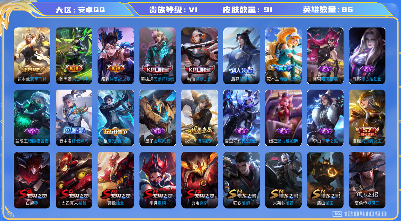 [12041098]【特价急出/详情看图】:安卓Q-V0-秩序白银II段位-86英雄-91皮肤-3传说-17史诗