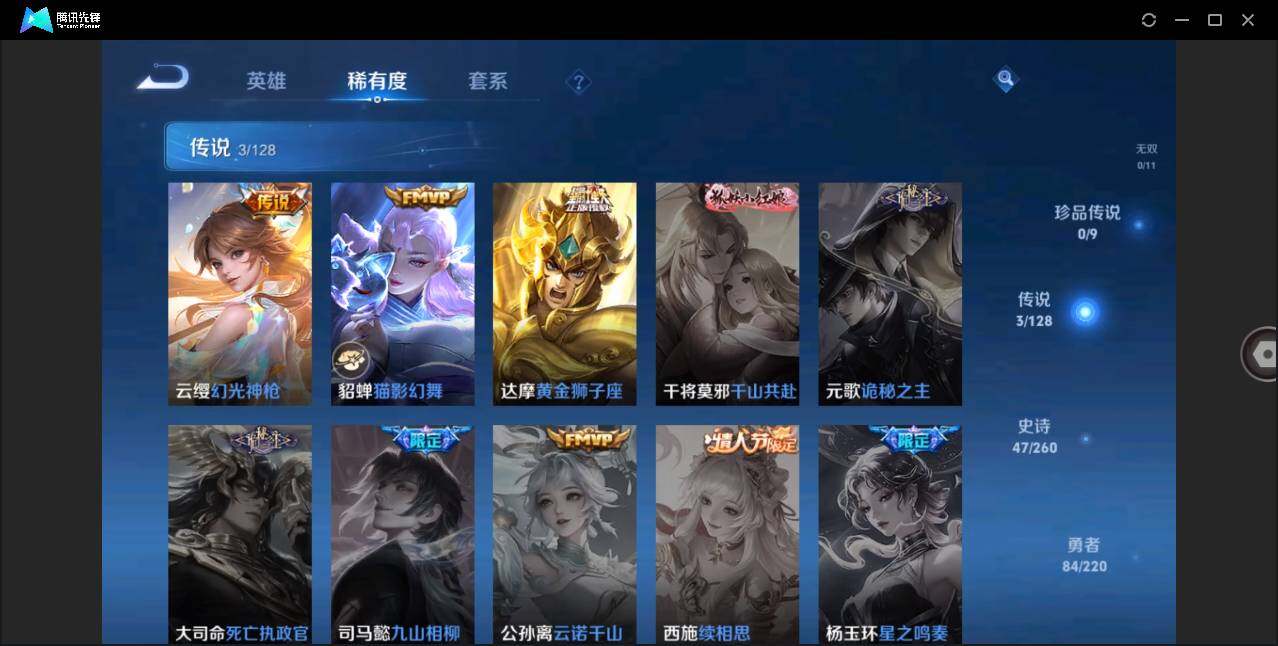 - [11655407]V9 2典藏 1无双 23传说 125英雄 393皮肤 可修改实名 优质装备:鸣剑·曳影,全息碎影(猴子典藏),韩信群星魔术团(韩信无双),黄金狮子座,末日机甲-孙尚香(绿蚂蚱),仲夏夜之梦(大飞蛾),音你心动-小乔,零号·赤焰,地狱之眼,超时空战士-狄仁杰,夜礼服假面,黄金天蝎座 传说皮:乘龙·铭钟鼎(赵云年限),吕布曦玄引,典韦战鼓燎原,幻光神枪 珍宝阁皮:万物之道,优雅恋人,玩趣恶龙 限定皮:愿照·九州拓(澜年限),鸣野蒿,至尊宝,凤求凰(白切鸡),时雨天司(水龙头),飞衡(韩信年限),遇见飞天,高山流水,诗剑行,齐天大圣,五谷丰年,青龙志(铠年限),游园惊梦,梁祝,烈魂,祈雪灵祝(雪兔子),李小龙,逐梦之影,辉光之辰,默契交锋-兰陵王,默契交锋-花木兰,孙行者,猪悟能,大圣娶亲,寅虎·赤拳(老虎年限) 史诗皮:器灵·浮梦炉,化蝶舞,灵蛊蚀心,星界战将,谪仙醉月,龙之律动,雪豹·霜爪,藏狐·褐绒,石田雨龙,茶境仙,怒海争锋,芈月浮光幕影,决胜骁骑,上官婉儿群星魔术团,奇遇星旅,蔬乡物语(鲁班七号),超元猎域,乘龙·聚宝船(安琪拉年限),百相守梦-黄忠,紫霞仙子,电玩小子(小书包),黄金分割率,特工魅影,千年之狐,江河有灵,魅语,百解令(蒙犽),高渐离燃音魔法,蒙恬荣光圣徽,无限星赏官,冰冠公主,偶像歌手,晚萤,暗夜猫娘,末日机甲-吕布,猫狗日记-孙策,猫狗日记-大乔,乱世虎臣,节奏热浪,修罗,女仆咖啡,摇滚巨星,水果甜心,绅士熊喵,天才门将,星夜王子,心灵骇客,功夫厨神,德古拉伯爵,暗隐猎兽者,幽灵船长,鬼剑武藏,心灵战警,舞动绿茵,地狱岩魂,诗语江南,纤云弄巧,拒霜思,缤纷独角兽,乘风破浪,逐浪之夏,水晶猎龙者,曙光守护者,箭羽风息,金属风暴,原初追逐者,圣诞狂欢,圣诞恋歌,鹰眼统帅,王者之锤,暗夜贵公子,魅力维加斯,黎明之约,赏金猎手,奇遇舞章,无心,未来纪元-赵云,玫瑰异探