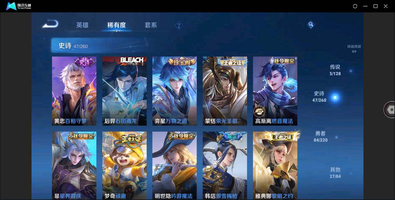 - [11913512]V8 1典藏 1珍品传说 21传说 125英雄 342皮肤 可修改实名 优质装备:九霄神辉(木兰典藏),怪盗基德,黄金白羊座,久胜战神,炽阳神光,末日机甲-孙尚香(绿蚂蚱),仲夏夜之梦(大飞蛾),时之恋人-刘备(电焊工),末日机甲-孙策,山海·炽霜斩(李信年限),燃星之曲,浮生妄,鹤羽星尊,妄想实况 传说皮:典韦战鼓燎原,幻光神枪 珍宝阁皮:妄想食味,女武神,玩趣恶龙 限定皮:愿照·九州拓(澜年限),愿照·山河定(司空震年限),鸣野蒿,至尊宝,飞衡(韩信年限),无限倾心-虞姬,五谷丰年,武圣,游园惊梦,天狼狩猎者,李小龙,如梦令-嫦娥,大圣娶亲,引擎之心,寅虎·赤拳(老虎年限),山海·玄木吟(马可年限) 史诗皮:鸭鸭历险记-刘禅,化蝶舞,星界战将,龙之律动,石田雨龙,百相守梦-周瑜,茶境仙,怒海争锋,撼地雄心,破空之剑,蒙犽顽岩魄,埋骨钱,琥珀纪元伽罗,蔬乡物语(鲁班七号),超元猎域,百相守梦-百里守约,百相守梦-黄忠,遇见神鹿,紫霞仙子,苍穹之光,特工魅影,千年之狐,永昼,江河有灵,末日机甲-莱西奥,魅语,百解令(蒙犽),蒙恬荣光圣徽,匿光破解者,冰冠公主,偶像歌手,电玩·爆裂旋风,暗夜猫娘,百相守梦(关羽),末日机甲-吕布,节奏热浪,修罗,摇滚巨星,水果甜心,绅士熊喵,天才门将,星夜王子,心灵骇客,功夫厨神,德古拉伯爵,暗隐猎兽者,幽灵船长,鬼剑武藏,暗渊魔法,心灵战警,乐园奇幻夜,舞动绿茵,拒霜思,缤纷独角兽,乘风破浪,逐浪之夏,水晶猎龙者,曙光守护者,金属风暴,原初追逐者,圣诞恋歌,鹰眼统帅,魅力维加斯,黎明之约,赏金猎手,无心