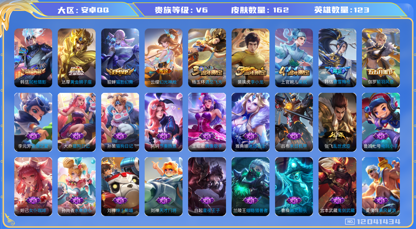 [12041434]【特价急出/详情看图】:安卓Q-V6-至尊星耀IV段位-123英雄-162皮肤-1典藏-3传说-47史诗