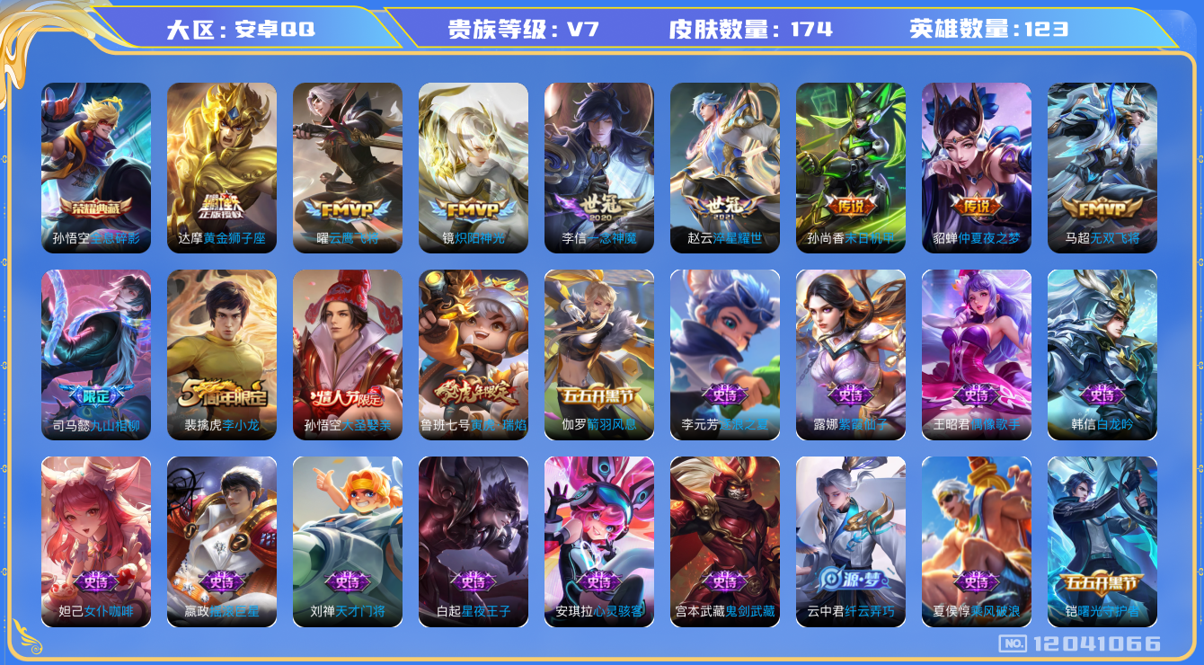 - [11624424]V7 2典藏 1无双 3珍品传说 8传说 124英雄 244皮肤 可修改实名 优质装备:鸣剑·曳影,星域神启(倪克斯贼亮),器灵·螭龙剑,怪盗基德,器灵·落星盏,黄金白羊座,炽阳神光 珍品传说:时之奇旅-孙策 传说皮:续相思,幻光神枪 珍宝阁皮:胡桃夹子,万物之道,蔷薇恋人 限定皮:愿照·九州拓(澜年限),愿照·山河定(司空震年限),逐霄战戟,鸣野蒿,傲雪梅枪,遇见飞天,高山流水,五谷丰年,祈雪灵祝(雪兔子),李小龙,山海·玄木吟(马可年限) 史诗皮:鸭鸭历险记-刘禅,器灵·浮梦炉,糖绘人间,瑰影绮梦,化蝶舞,星界战将,龙之律动,百相守梦-周瑜,茶境仙,破空之剑,东方月初,蒙犽顽岩魄,埋骨钱,曹操夜都魔契,百相守梦-百里守约,百相守梦-黄忠,织梦人,紫霞仙子,特工魅影,千年之狐,永昼,江河有灵,魅语,蒙恬荣光圣徽,无限星赏官,白蛇,电玩·爆裂旋风,猫狗日记-孙策,时之恋人-孙尚香,摇滚巨星,水果甜心,天才门将,星夜王子,心灵骇客,功夫厨神,鬼剑武藏,心灵战警,舞动绿茵,地狱岩魂,纤云弄巧,拒霜思,乘风破浪,逐浪之夏,曙光守护者,金属风暴,圣诞恋歌,鹰眼统帅,暗夜贵公子,魅力维加斯,赏金猎手,无心,未来纪元-赵云,玫瑰异探