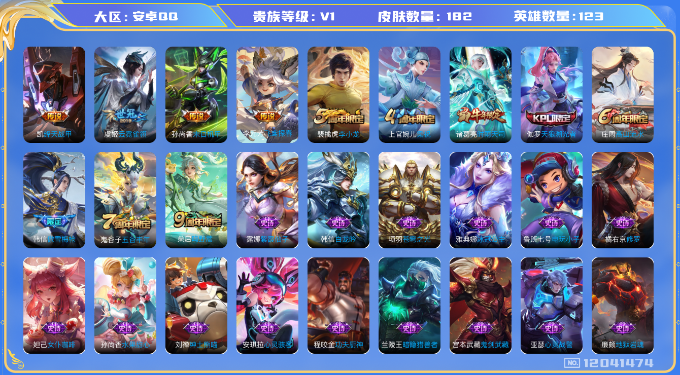 - [11388080]V7 1典藏 10传说 124英雄 235皮肤 可修改实名 优质装备:全息碎影(猴子典藏),冠军飞将,末日机甲-孙尚香(绿蚂蚱),地狱火,仲夏夜之梦(大飞蛾),超时空战士-狄仁杰 珍宝阁皮:优雅恋人 限定皮:白虎志(电光耗子),凤求凰(白切鸡),太华(伽罗年限),梅西,武陵仙君(小桃花),神威(电光马子),遇见飞天,游园惊梦,梁祝,御风骁将(吕布年限),龙胆,逐梦之翼,李小龙,逐梦之影,朱雀志(守约年限),永曜之星,辉光之辰,如梦令-嫦娥,如梦令-后羿,一生所爱,大圣娶亲,寅虎·心曲(虎婆) 史诗皮:化蝶舞,龙之律动,藏狐·褐绒,茶境仙,紫霞仙子,苍穹之光,电玩小子(小书包),黄金分割率,特工魅影,千年之狐,江河有灵,蒙恬荣光圣徽,无限星赏官,电玩·爆裂旋风,乱世虎臣,摇滚巨星,水果甜心,星夜王子,德古拉伯爵,暗隐猎兽者,鬼剑武藏,乐园奇幻夜,舞动绿茵,地狱岩魂,纤云弄巧,繁星吟游(呼啦呼啦),拒霜思,乘风破浪,逐浪之夏,水晶猎龙者,曙光守护者,金属风暴,原初追逐者,圣诞狂欢,圣诞恋歌,鹰眼统帅,暗夜贵公子,魅力维加斯,黎明之约,无心,未来纪元-赵云