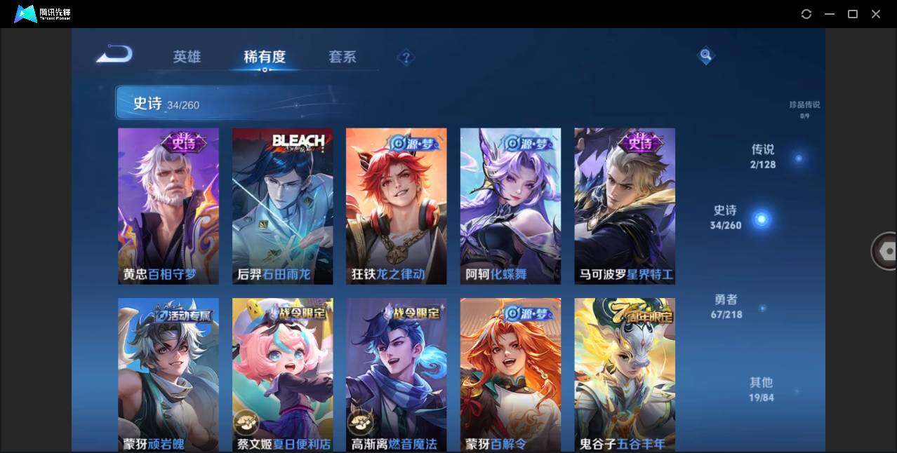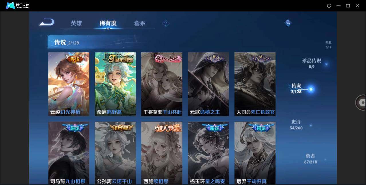 - PX_2064179-45 安卓QQ/永恒钻石/211皮肤/123英雄/1典藏/0珍品无双/0无双/0珍品传说/7传说/43史诗/7稀有英雄 【1 典藏皮肤】最初的交响 伽罗, 【7 传说皮肤】黄金狮子座 达摩,一念神魔 李信,愿照·九州拓 澜,幻光神枪 云缨,愿照·山河定 司空震,祥瑞亨通 裴擒虎,鸣野蒿 桑启, 【43 史诗皮肤】末日机甲 吕布,蔬乡物语 鲁班七号,高山流水 庄周,天秀·音浪
