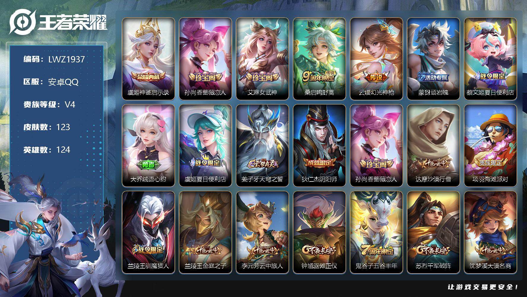 [12039793]【暑期末清货/特价急出/永久包赔】:安卓Q-V4-至尊星耀I段位-124英雄-123皮肤-1典藏-2传说-34史诗 【荣耀典藏】:虞姬神鉴启示录 【内测皮肤】:孙尚香蔷薇恋人,艾琳女武神 【传说皮肤】:桑启鸣野蒿,云缨幻光神枪 【限定皮肤】:蒙犽顽岩魄,蔡文姬夏日便利店,大乔绒语心约,虞姬夏日便利店,姜子牙天穹之誓,狄仁杰阴阳师,孙尚香蔷薇恋人,达摩沙漠行僧,项羽海滩派对,兰陵王驯魔猎人,兰陵王金庭之子,李元芳云中旅人,钟馗驱傩正仪,鬼谷子五谷丰年,苏烈千军破阵,沈梦溪大漠名商,裴擒虎擒涛扼浪,云中君纤云弄巧,嫦娥拒霜思,鲁班大师探海日志,桑启海盐诗旅,艾琳女武神,张良古海寻踪,蒙犽百解令,高渐离燃音魔法,妲己灵卜魔法,鬼谷子天穹祈灯,沈梦溪龙舞盛年,刘邦剑破天穹,程咬金群星魔术团,刘备异域游侠,周瑜熔金海岸 【赛季限定】:达摩沙漠行僧,兰陵王金庭之子,张良古海寻踪,李元芳云中旅人,钟馗驱傩正仪,苏烈千军破阵,沈梦溪大漠名商,裴擒虎擒涛扼浪,鲁班大师探海日志,桑启海盐诗旅,鬼谷子天穹祈灯,刘邦剑破天穹,姜子牙天穹之誓 【战令限定】:蔡文姬夏日便利店,虞姬夏日便利店,兰陵王驯魔猎人,高渐离燃音魔法,妲己灵卜魔法 【史诗皮肤】:赵云未来纪元,甄姬冰雪圆舞曲,王昭君偶像歌手,宫本武藏鬼剑武藏,孙尚香蔷薇恋人,孙尚香水果甜心,妲己魅力维加斯,妲己女仆咖啡,李白千年之狐,吕布末日机甲,张飞乱世虎臣,花木兰水晶猎龙者,夏侯惇乘风破浪,雅典娜冰冠公主,安琪拉心灵骇客,百里守约特工魅影,刘禅天才门将,李元芳逐浪之夏,阿轲节奏热浪,兰陵王驯魔猎人,云中君纤云弄巧,沈梦溪月团寄思,嫦娥拒霜思,澜赏金猎手,鬼谷子五谷丰年,蒙犽百解令,妲己灵卜魔法,高渐离燃音魔法,蔡文姬夏日便利店,蒙犽顽岩魄,马可波罗星界特工,阿轲化蝶舞,狂铁龙之律动,后羿石田雨龙,黄忠百相守梦 【其他皮肤】:项羽海滩派对,赵云忍炎影,艾琳女武神,白起白色死神,武则天东方不败,扁鹊化身博士,扁鹊救世之瞳,典韦黄金武士,亚瑟死亡骑士,狄仁杰阴阳师,王昭君幻想奇妙夜,狂铁命运角斗场,老夫子功夫老勺,诸葛亮掌控之力,苏烈坚韧之力,大乔守护之力,吕布野性能量,沈梦溪鲨炮海盗猫,姜子牙炽热元素使,鲁班七号黑桃队长,钟馗驱傩正仪,鲁班大师乓乓大师,苏烈千军破阵,达摩沙漠行僧,兰陵王金庭之子,沈梦溪大漠名商,李元芳云中旅人,刘备潮玩