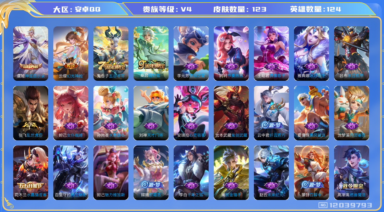 [12039793]【暑期末清货/特价急出/永久包赔】:安卓Q-V4-至尊星耀I段位-124英雄-123皮肤-1典藏-2传说-34史诗