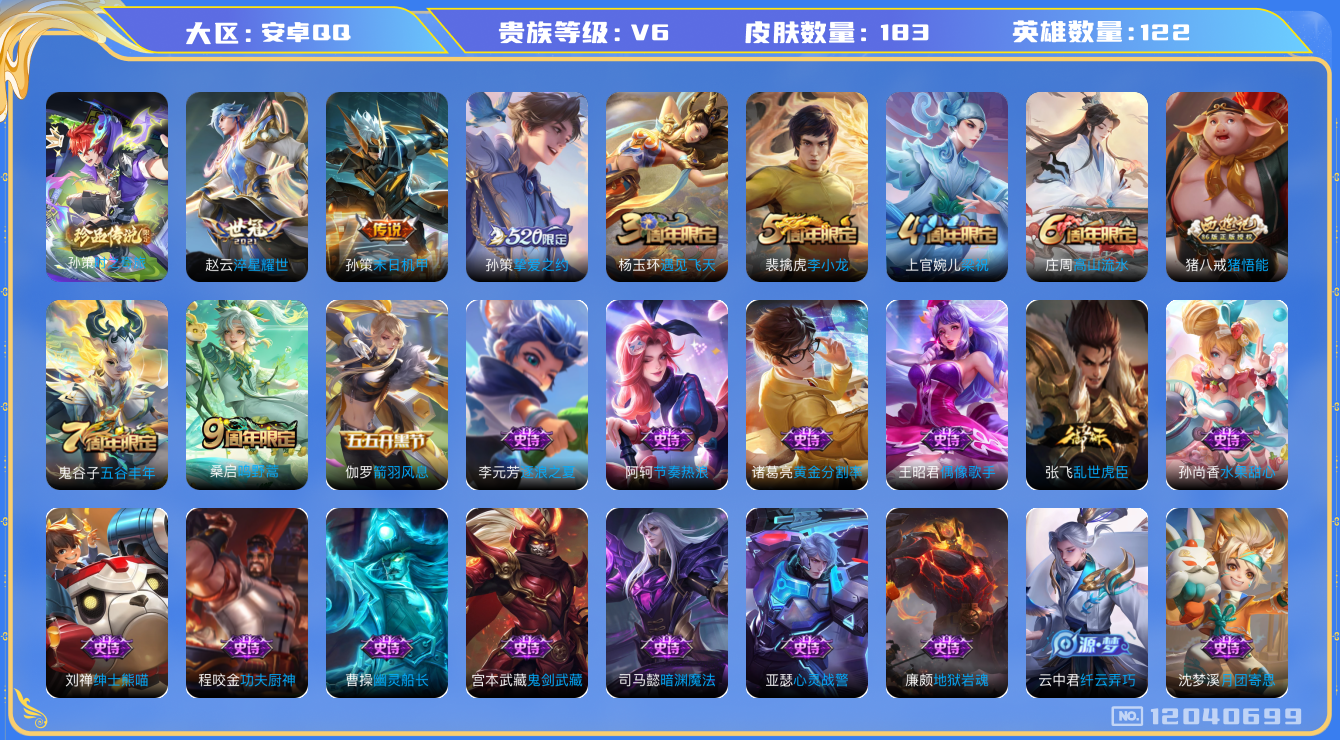 [12040699]【特价急出/详情看图】:安卓Q-V6-最强王者段位-122英雄-183皮肤-1珍品传说-4传说-45史诗