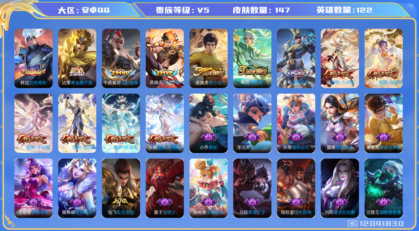 [12041830]【特价急出/详情看图】:安卓Q-V5-至尊星耀V段位-122英雄-147皮肤-1典藏-10传说-45史诗