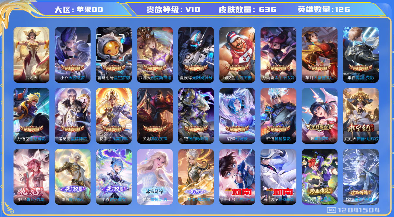 [12041504]【特价急出/详情看图】:苹果Q-V10-尊贵铂金I段位-126英雄-636皮肤-15典藏-7无双-4珍品传说-111传说-221史诗 【荣耀典藏】:武则天英雄,孙悟空全息碎影,武则天倪克斯神谕,夏侯惇无限飓风号,小乔天鹅之梦,孙尚香杀手不太冷,鲁班七号星空梦想,芈月大秦宣太后,程咬金活力突击,李白鸣剑曳影,诸葛亮星域神启,花木兰九霄神辉,关羽赤影疾锋,铠银白咏叹调,貂蝉幻阙歌,韩信弑枪猎影 【无双皮肤】:武则天神器明辉仪,妲己青丘九尾,瑶真我赫兹,李白碎月剑心,小乔时之魔女,甄姬雪境奇遇,曜器灵螭龙剑 【珍品传说】:马可波罗怪盗基德,鲁班七号江户川柯南,孙策时之奇旅,嫦娥器灵落星盏 【传说皮肤】:杨玉环星之鸣奏,后羿千劫归真,司空震愿照山河定,女娲愿照千秋盛,妲己愿照众生和,澜愿照九州拓,蔡文姬愿照福禄聚,虞姬愿照岁时盈,云缨幻光神枪,嬴政玄雷天君,桑启鸣野蒿,墨子黄金天蝎座,海月金乌负日,亚连落雪白狼,吕布曦玄引,貂蝉曦玄引,孙尚香乘龙问璇玑,孙策乘龙淬吴钩,赵云乘龙铭钟鼎,马超琥珀纪元,铠琥珀纪元,艾琳觅芳踪,狄仁杰夜礼服假面,王昭君永恒水手月亮,甄姬至美化雀舞,大乔时之奇旅,鲁班七号时之奇旅,兰陵王影龙天霄,吕布遇见神鼓,宫本武藏惊梅引,云缨鹤归松栖,上官婉儿妄想奇谈,马可波罗妄想实况,东皇太一灼幽烈阳,诸葛亮鹤羽星尊,澜电玩雷克斯,亚瑟追逃游戏,安琪拉追逃游戏,张飞百相守梦,公孙离记忆之芯,夏洛特浮生妄,干将莫邪画中仙,花木兰燃星之曲,虞姬无限倾心,项羽无限倾心,伽罗炽翼辉光,孙悟空齐天大圣,小乔山海琳琅生,曜山海苍雷引,李信山海炽霜斩,吕布怒海麟威,李白诗剑行,狄仁杰神器狴犴令,不知火舞绯月行,王昭君星穹之声,百里守约碎云,橘右京枫霜尽,娜可露露前尘镜,孙尚香音你闪耀,马可波罗深海之息,后羿无尽星芒,马超无双飞将,大乔挚爱花嫁,孙策挚爱之约,露娜启示之音,蔡文姬花朝如约,女娲补天,孙策末日机甲,瑶时之祈愿,裴擒虎寅虎赤拳,鲁班七号寅虎瑞焰,孙尚香异界灵契,貂蝉遇见胡旋,赵云淬星耀世,王昭君乞巧织情,西施游龙清影,曜李逍遥 ,周瑜音你心动,小乔音你心动,李元芳飞鸢探春,兰陵王默契交锋,公孙离祈雪灵祝,诸葛亮时雨天司,铠绛天战甲,镜炽阳神光,虞姬启明星使,孙悟空零号赤焰,关羽武圣,曜云鹰飞将,李信一念神魔,刘备时之恋人,伽罗太华,貂蝉猫影幻舞,张良黄金白羊座