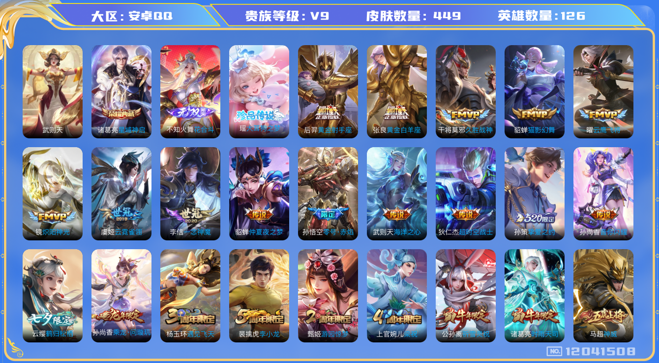 [12041508]【特价急出/详情看图】:安卓Q-V9-最强王者段位-126英雄-449皮肤-1典藏-1无双-1珍品传说-25传说-136史诗