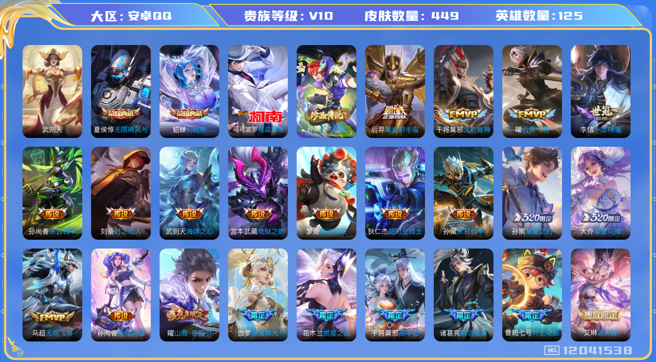 [12041538]【特价急出/详情看图】:安卓Q-V10-最强王者段位-125英雄-449皮肤-2典藏-2珍品传说-35传说-135史诗