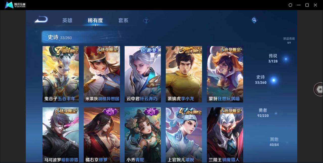 - [11962710]V8 16传说 124英雄 204皮肤 可修改实名 优质装备:黄金射手座,冠军飞将,一念神魔,末日机甲-孙尚香(绿蚂蚱),地狱火,仲夏夜之梦(大飞蛾),地狱之眼,胖达荣荣,超时空战士-狄仁杰,无双飞将,电玩·雷克斯,澜逐花归海 珍宝阁皮:万物之道 限定皮:愿照·九州拓(澜年限),鸣野蒿,白虎志(电光耗子),五谷丰年,青龙志(铠年限),梁祝,玄武志(苏烈年限),朱雀志(守约年限),引擎之心,冰霜恋舞曲 史诗皮:织梦人,紫霞仙子,电玩小子(小书包),白龙吟,黄金分割率,特工魅影,千年之狐,永昼,晚萤,末日机甲-吕布,猫狗日记-孙策,乱世虎臣,节奏热浪,修罗,水果甜心,星夜王子,心灵骇客,功夫厨神,德古拉伯爵,暗隐猎兽者,幽灵船长,鬼剑武藏,舞动绿茵,地狱岩魂,纤云弄巧,缤纷独角兽,乘风破浪,逐浪之夏,水晶猎龙者,箭羽风息,金属风暴,圣诞狂欢,圣诞恋歌,鹰眼统帅,暗夜贵公子,赏金猎手,无心