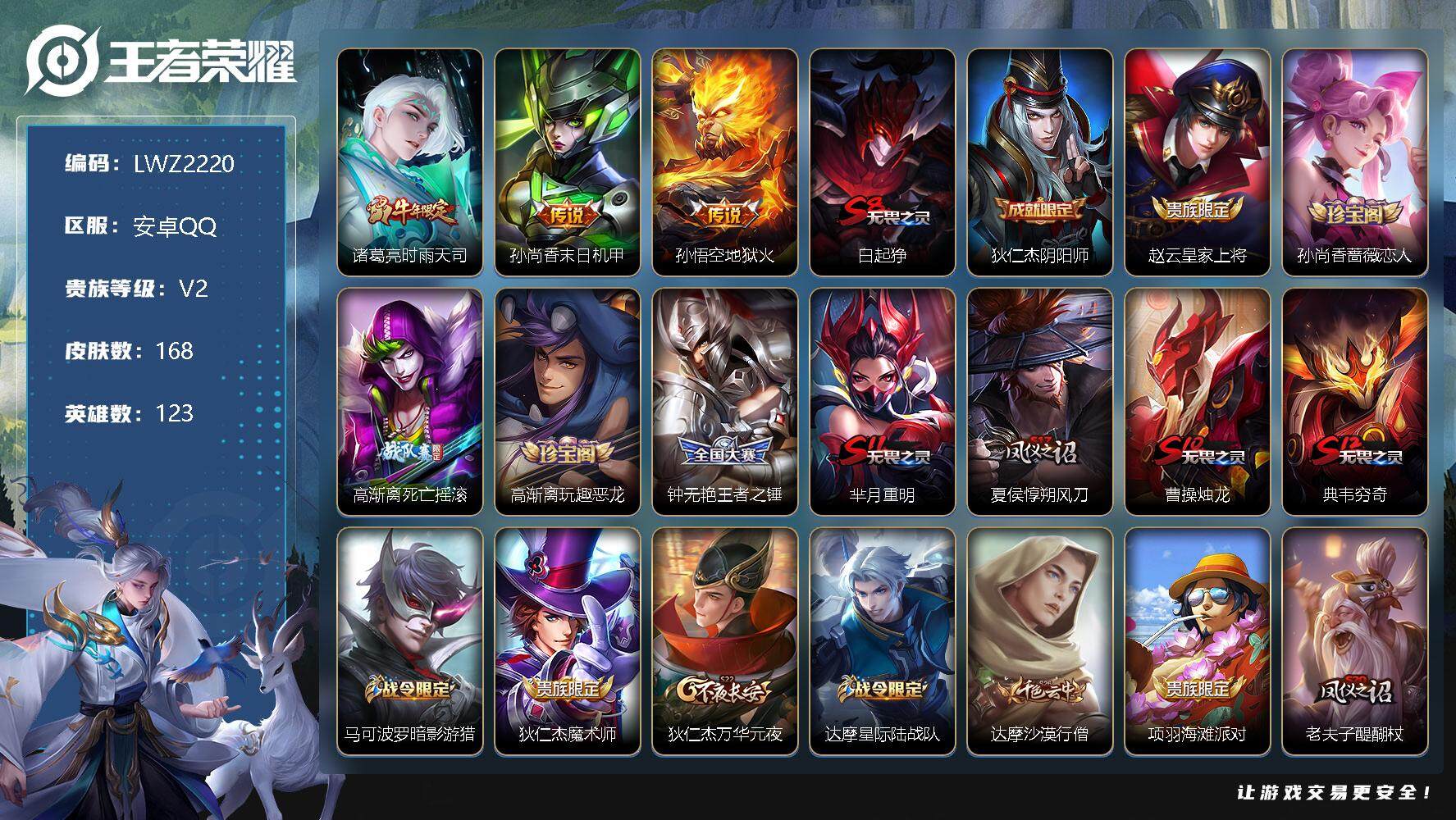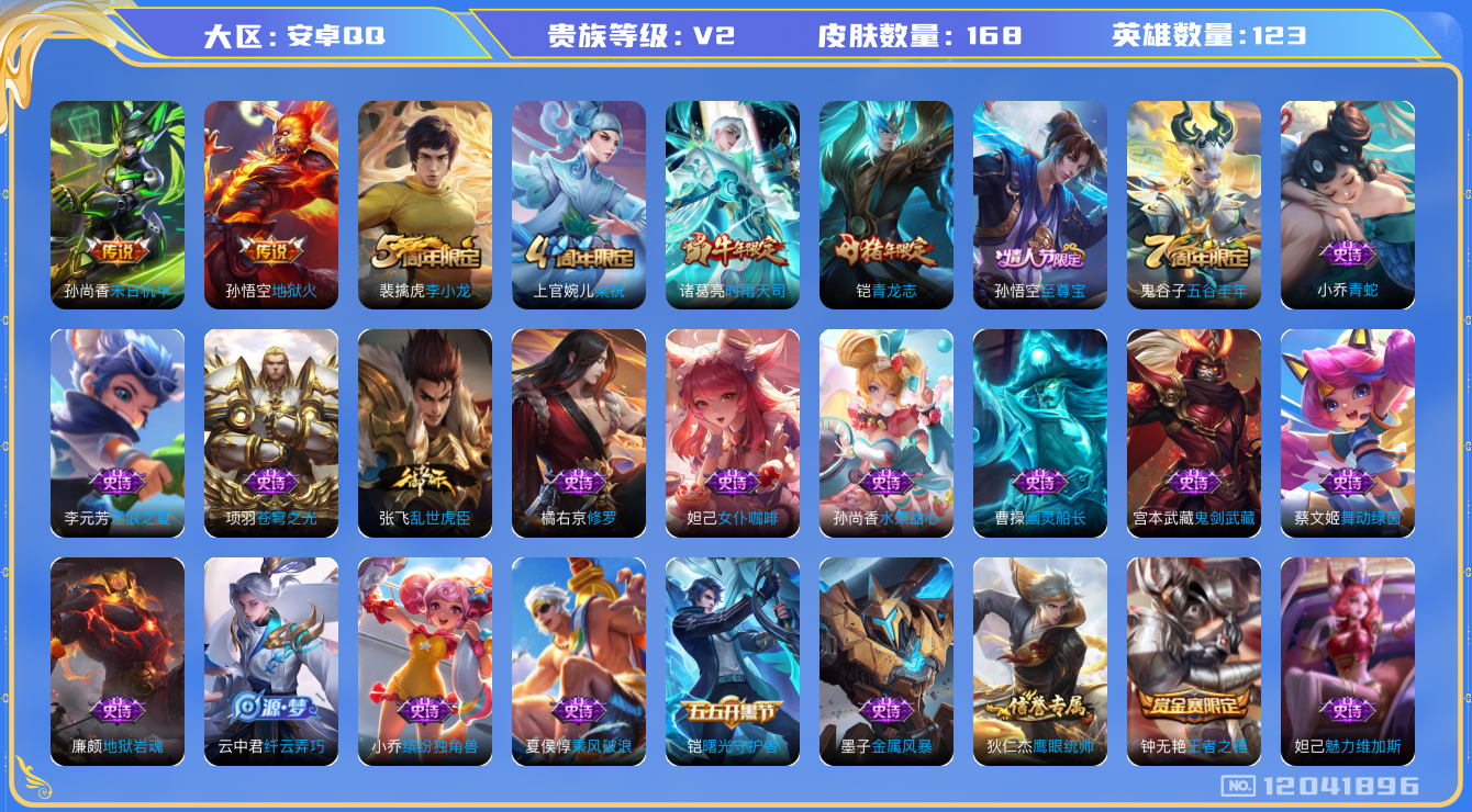 [12041896]【特价急出/详情看图】:安卓Q-V2-至尊星耀I段位-123英雄-168皮肤-3传说-33史诗