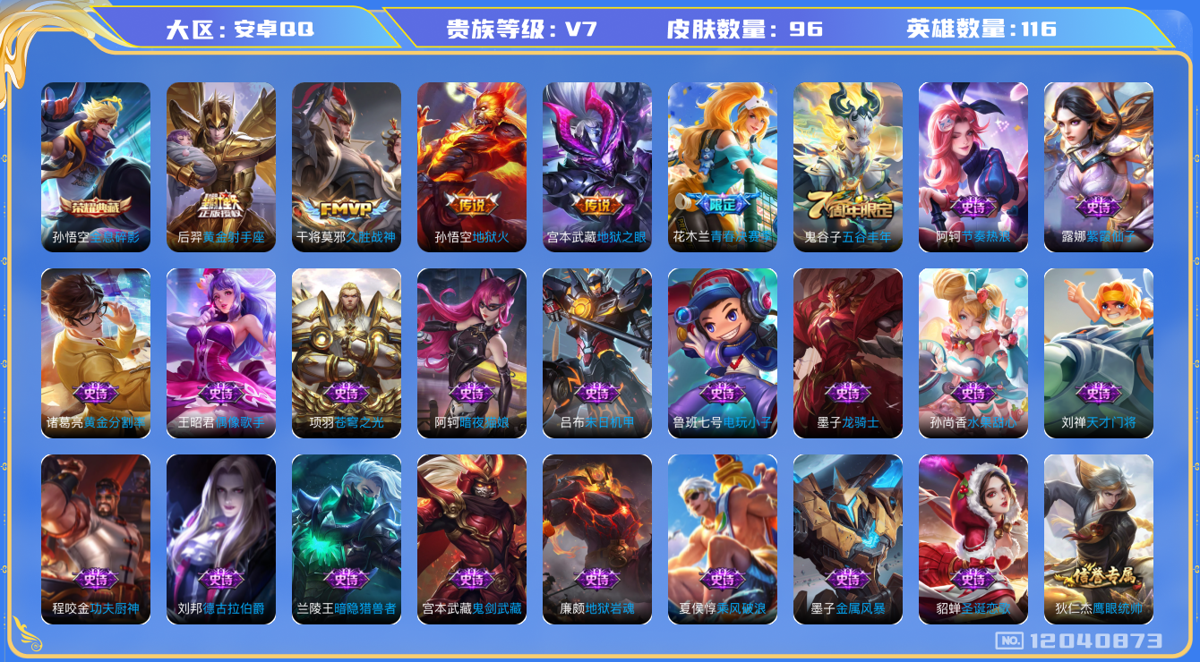 [12040873]【特价急出/详情看图】:安卓Q-V7-尊贵铂金I段位-116英雄-96皮肤-1典藏-4传说-35史诗
