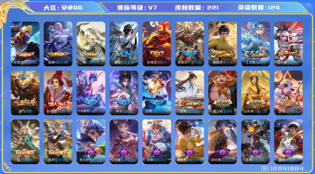 [12041884]【特价急出/详情看图】:安卓Q-V7-最强王者段位-124英雄-221皮肤-1典藏-6传说-56史诗