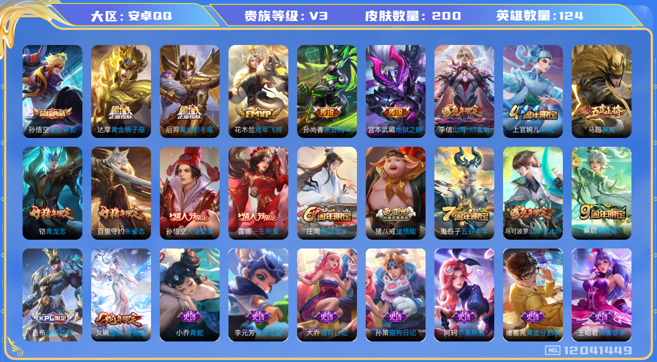 [12041449]【特价急出/详情看图】:安卓Q-V3-最强王者段位-124英雄-200皮肤-1典藏-9传说-55史诗