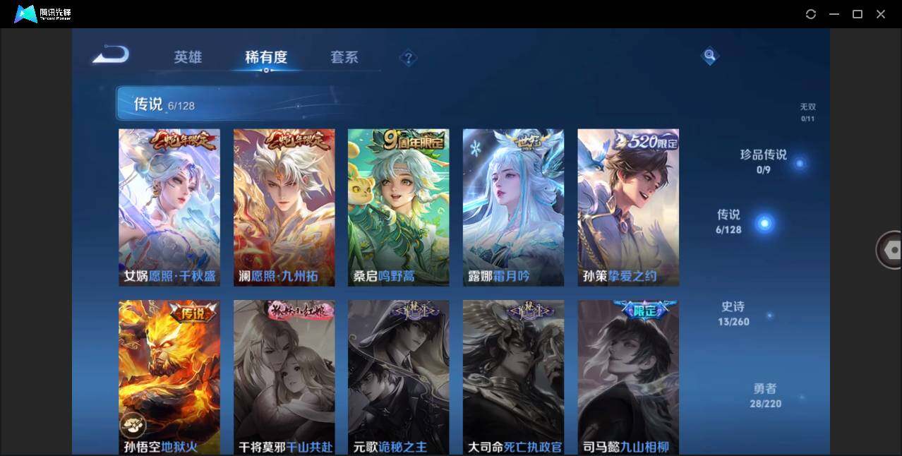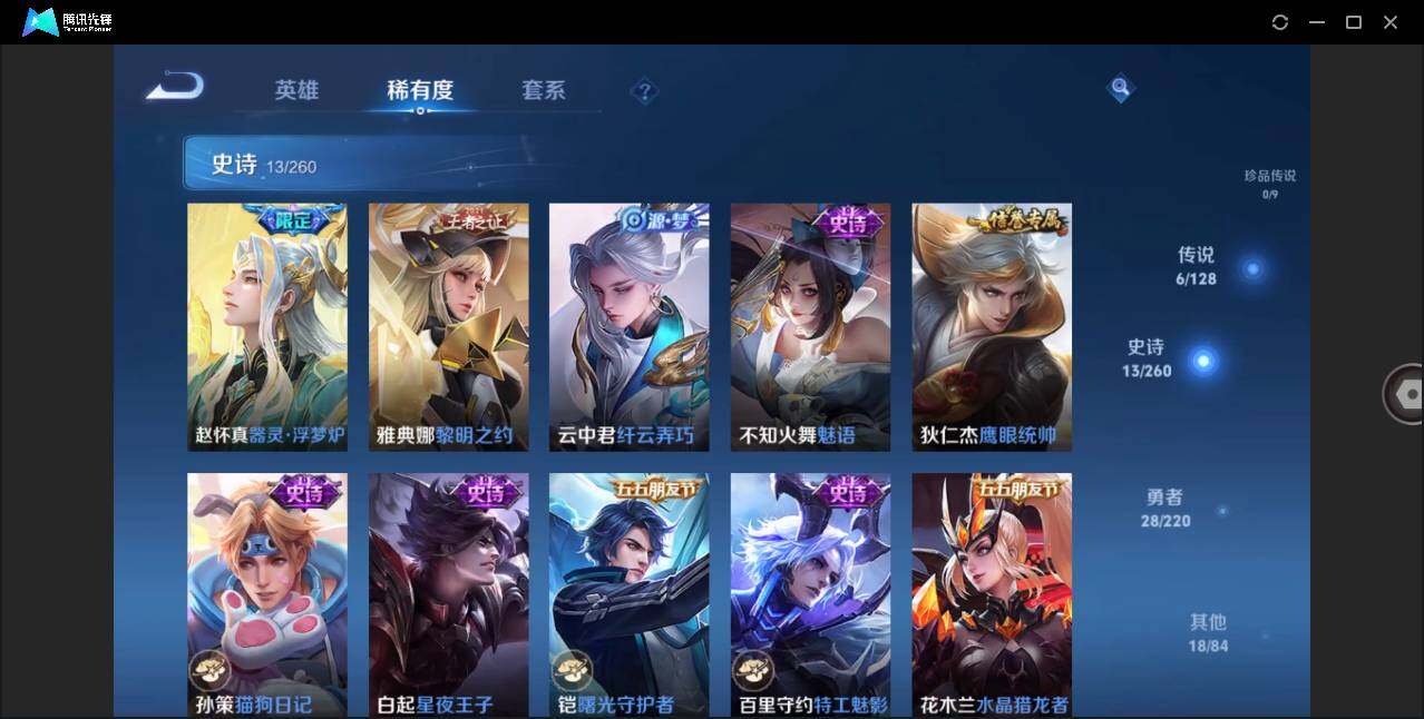 - [11795544]V7 7传说 124英雄 197皮肤 可修改实名 优质装备:黄金狮子座,久胜战神,一念神魔,末日机甲-孙尚香(绿蚂蚱),仲夏夜之梦(大飞蛾) 珍宝阁皮:优雅恋人 限定皮:至尊宝,时雨天司(水龙头),冰锋战神,梁祝,御风骁将(吕布年限),逐梦之星,李小龙,逐梦之光,如梦令-后羿,霸王别姬-项羽,霸王别姬-虞姬,默契交锋-兰陵王,大圣娶亲 史诗皮:化蝶舞,电玩小子(小书包),黄金分割率,特工魅影,千年之狐,无限星赏官,猫狗日记-孙策,乱世虎臣,修罗,摇滚巨星,水果甜心,星夜王子,功夫厨神,德古拉伯爵,幽灵船长,纤云弄巧,繁星吟游(呼啦呼啦),逐浪之夏,水晶猎龙者,曙光守护者,箭羽风息,金属风暴,鹰眼统帅,魅力维加斯,无心