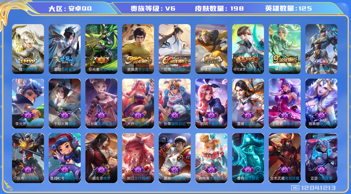 [12041213]【特价急出/详情看图】:安卓Q-V6-最强王者段位-125英雄-198皮肤-4传说-64史诗