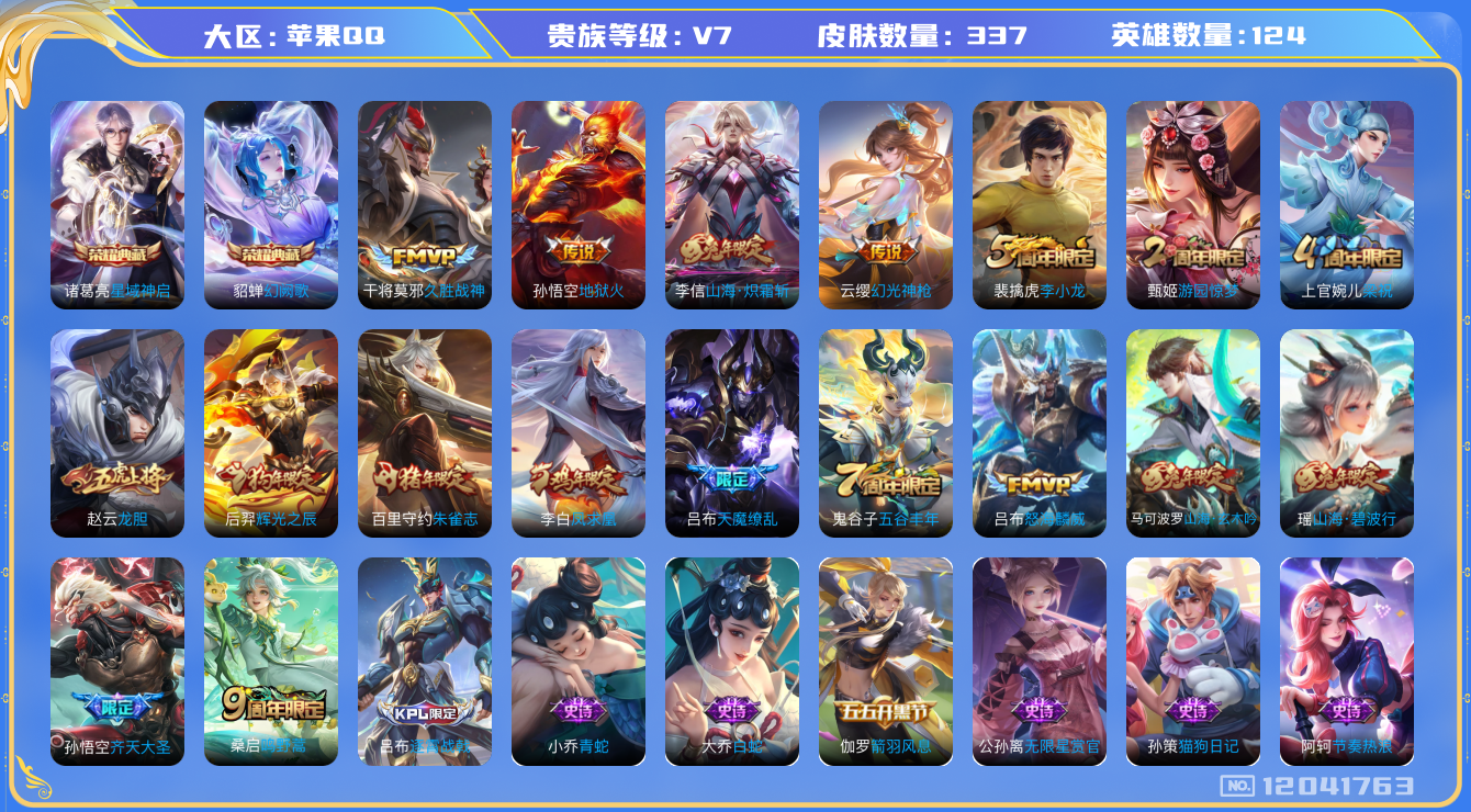 [12041763]【特价急出/详情看图】:苹果Q-V7-最强王者段位-124英雄-337皮肤-2典藏-9传说-94史诗